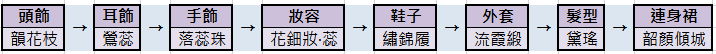 在有生之年2.0【韶顏傾城】中,許多部件的製作會使用到本套裝其他部件。例如手飾落蕊珠,其中一個材料就需要【韶顏傾城】的頭飾韻花枝。因此,強烈建議各位搭配師本套裝製作順序為: