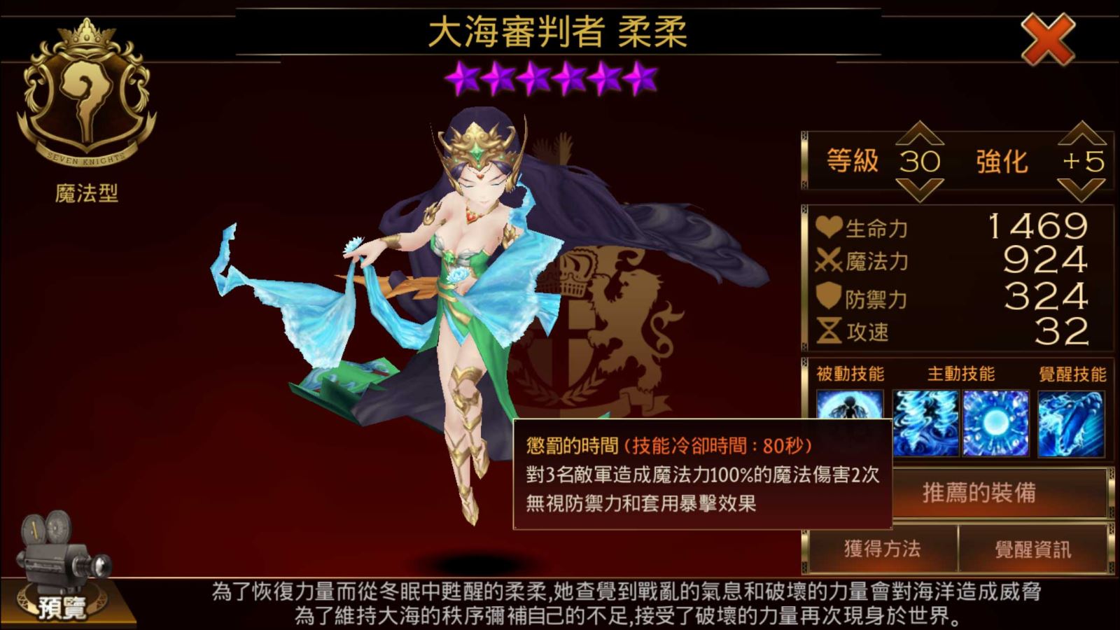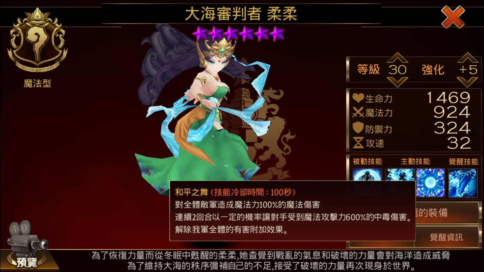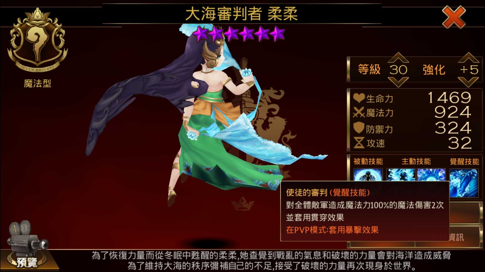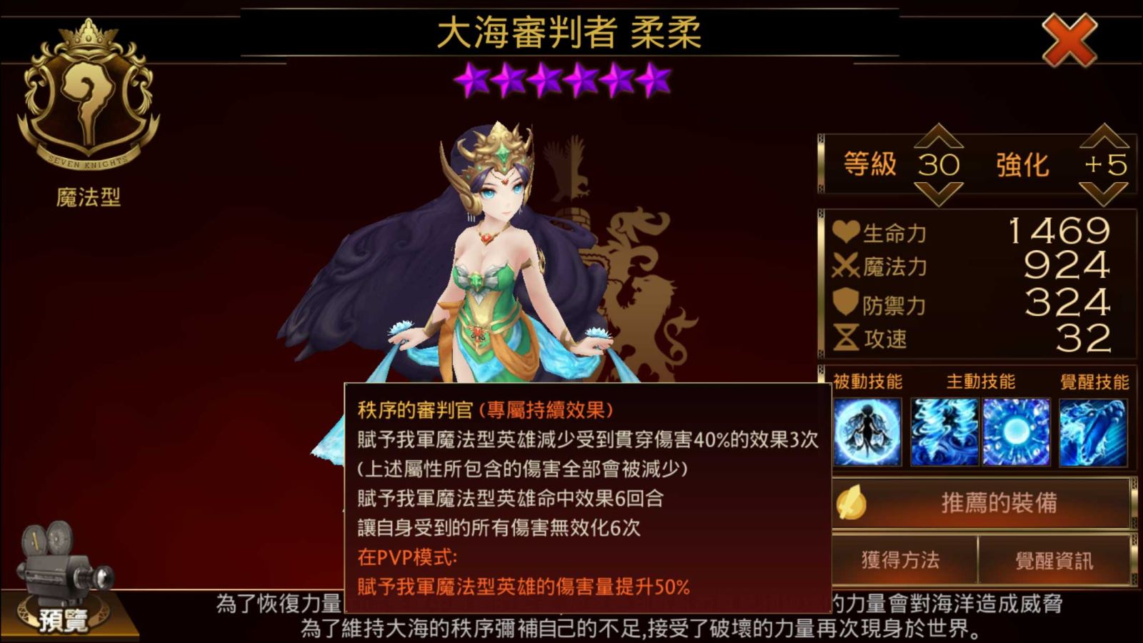 柔柔為「七騎士」國際版特有的「隱藏的大師」之一,是源自印尼的專屬角色。柔柔是「Roro」的音譯,是大海中的精靈;在《七騎士》的世界中,原本沉睡在大海裡,因受破壞的力量影響,才從長眠中甦醒,要再次守護大海的秩序。下面則是她的技能。