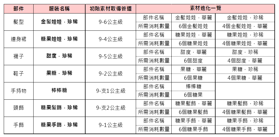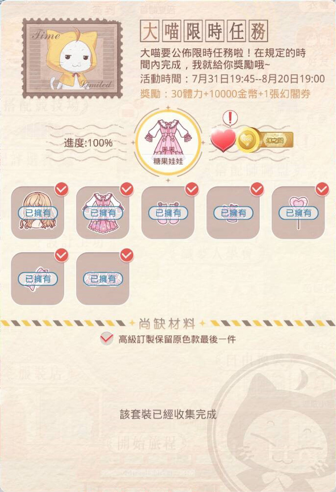 這次大喵限時任務蒐集這套甜死人不償命的「糖果娃娃」可獲得特定獎勵,其實這個關卡並不難,搭配師們只要第九章公主級都有通過的話,在遊戲這段期間努力掃蕩,湊足數量,即可輕鬆完成任務囉!另外小編偷偷告訴大家,糖果髮飾可是有生之年3.0「格萊斯」的材料喔!如果完成大喵限時任務後,有多餘的心力不妨多收集幾個喔!