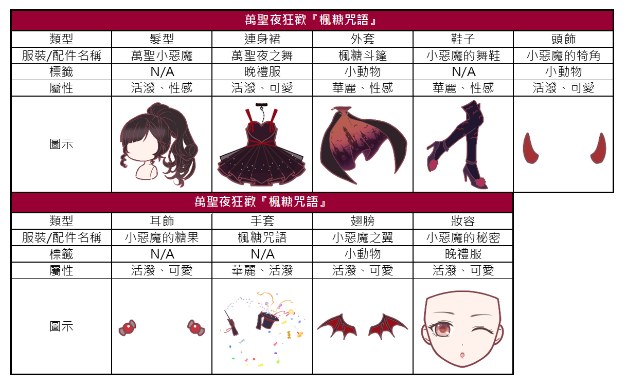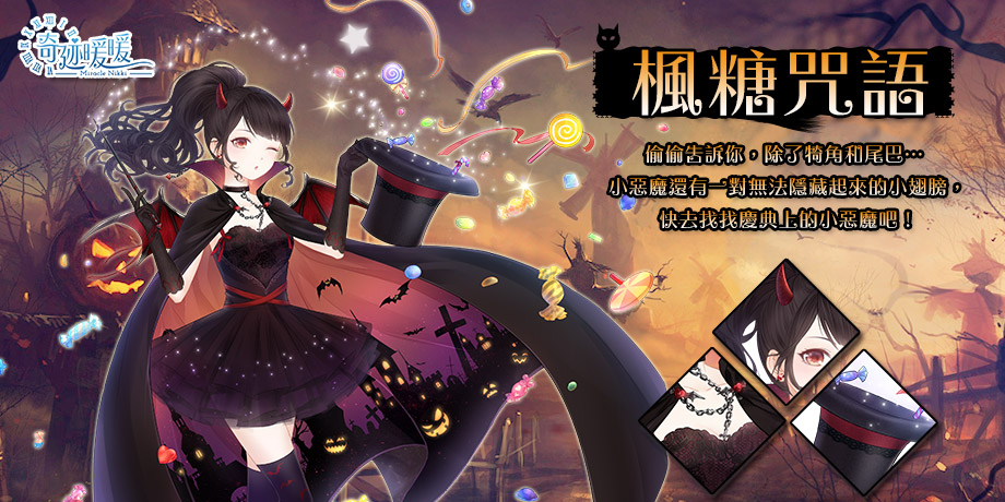 傳說小惡魔將會在萬聖節這一天,藉著節日的燭火來到人間,穿上特製的舞裙,混在奇裝異服的狂歡人群之中一起玩耍。搭配師們也趕快換上萬聖套裝,說不定可以幸運地遇到真正的小惡魔喔!你,是否能抓住小惡魔的尾巴呢?