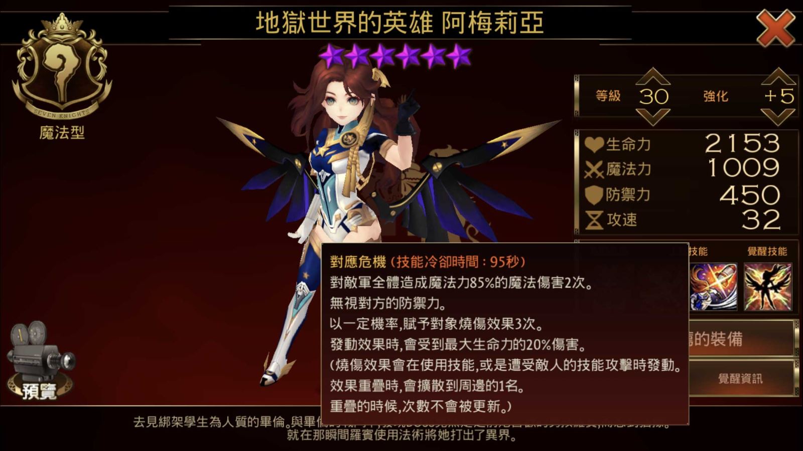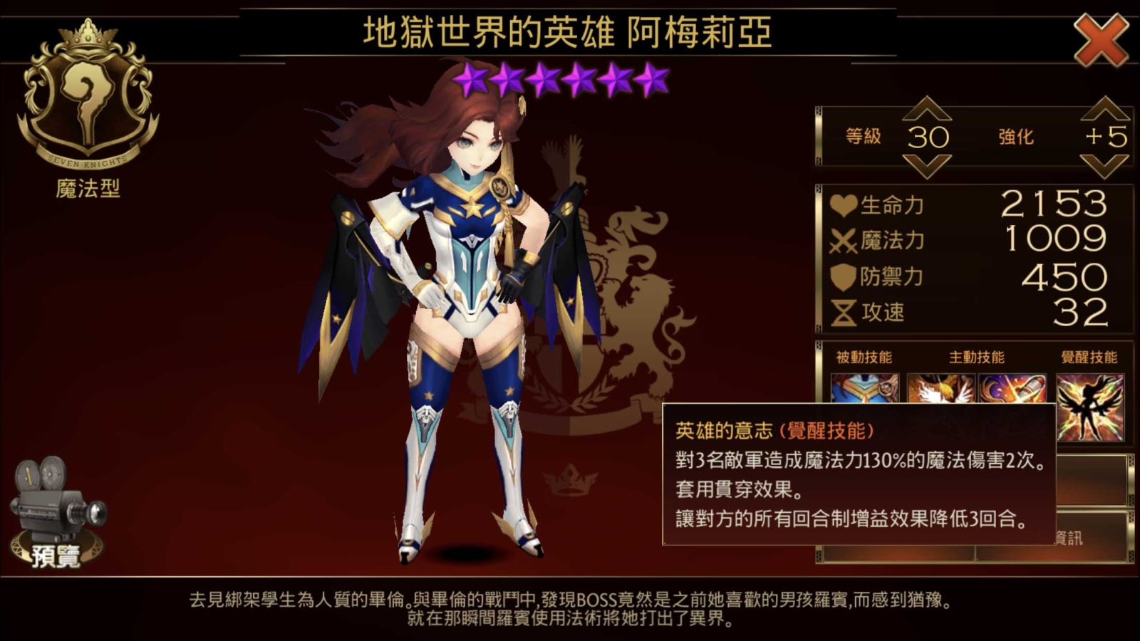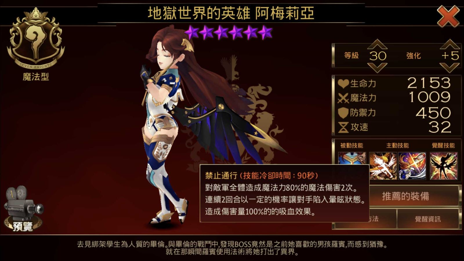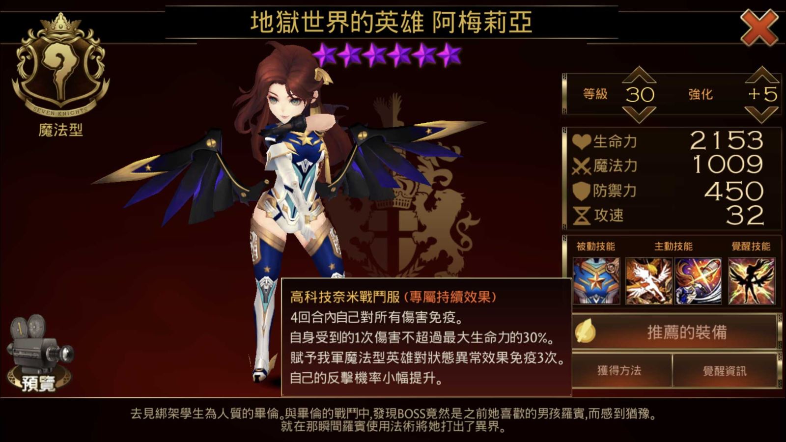 阿梅莉亞的被動技能,讓她在以魔法型的英雄為主的隊伍中,能取代艾莉希亞或是碧的位置;加上4回合盾與單次傷害不超過30%,她的存活機會也非常高。而主動技能皆為次數攻擊,並帶有異常效果,初期時發動能消耗對手的免疫效果次數,後期也可以控場;加上覺醒技兼具貫穿與推進,技能組合都很實用,將是魔法型英雄隊伍中不可欠缺的一員喔。