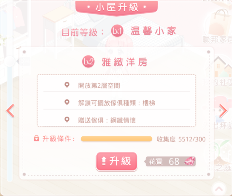透過「升級」,每升一級,小屋將會開放一層新空間,同時還會開放獲得更多傢俱種類可以購買、並送升級獎勵傢俱給搭配師喔!除了增加樓層,搭配師還可以進行房間擴建,以獲得更多擺放空間。