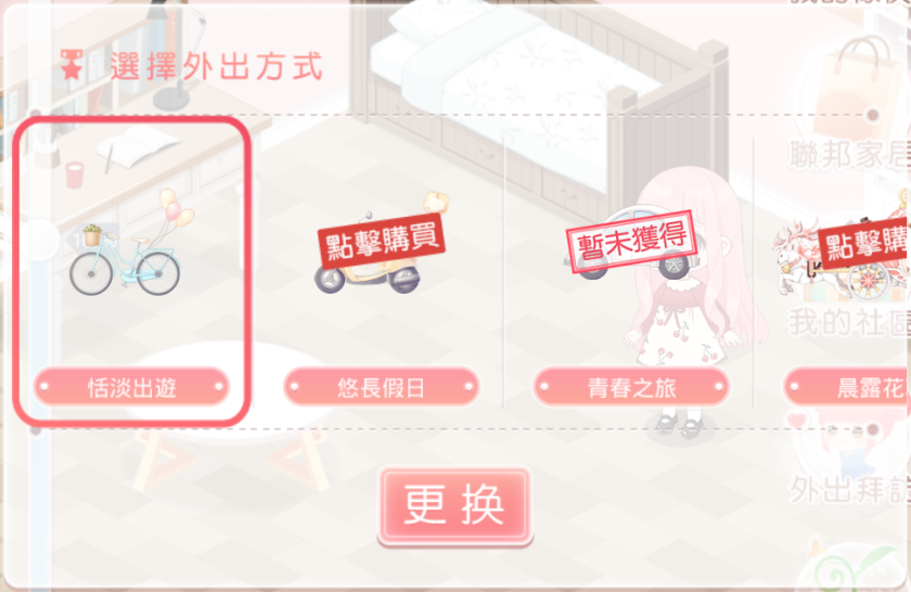 透過交通工具「更換」選擇外出方式,將會改變在遊戲主畫面顯示的交通工具喔!一開始系統預設是繫著氣球的自行車<恬靜出遊>。搭配師可在「小屋資訊」中更換其他不同的交通工具,有繫著大喵汽球的摩托車<悠長假日>、帥氣的轎車<青春之旅>,還有華麗小馬車<晨露花車>喔!