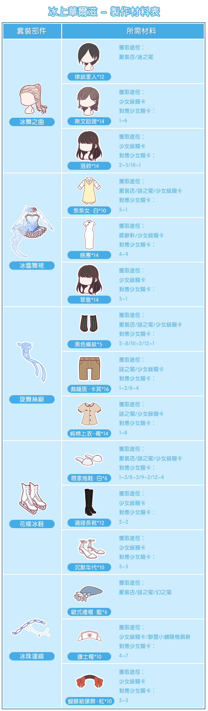 在如此寒冷的季節,《奇迹暖暖》暖心贈送給所有搭配師【冰上華爾滋】套裝設計圖!在活動時間2018/02/09 05:00 ~ 2018/02/25 23:59內登錄遊戲,即可從遊戲內的信箱免費領取【冰上華爾滋】套裝設計圖!搭配師們是不是都很迫不及待的想知道製作材料是什麼呢?別擔心,小編在這邊幫搭配師統整【冰上華爾滋】套裝設計圖的製作材料與數量,也同時加映【冰上華爾滋】的套裝部件表,暖粉們可以參考下方表格哦!