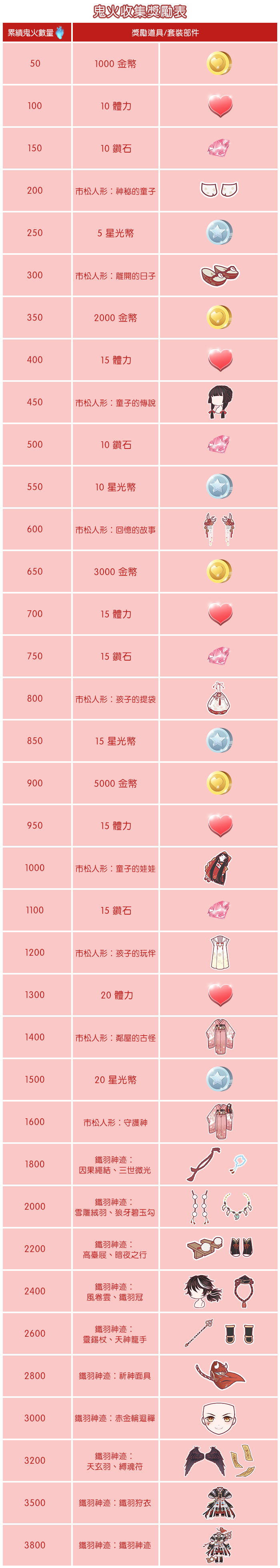 在活動期間2018/03/15 05:00 ~ 2018/03/22 23:59,通關全地圖任一關卡,不分少女級或公主級,皆可獲得鬼火。鬼火累計達指定數量,即可獲得相對應的獎勵或套裝部件,暖粉們可以參考下方小編整理的獎勵一覽表。