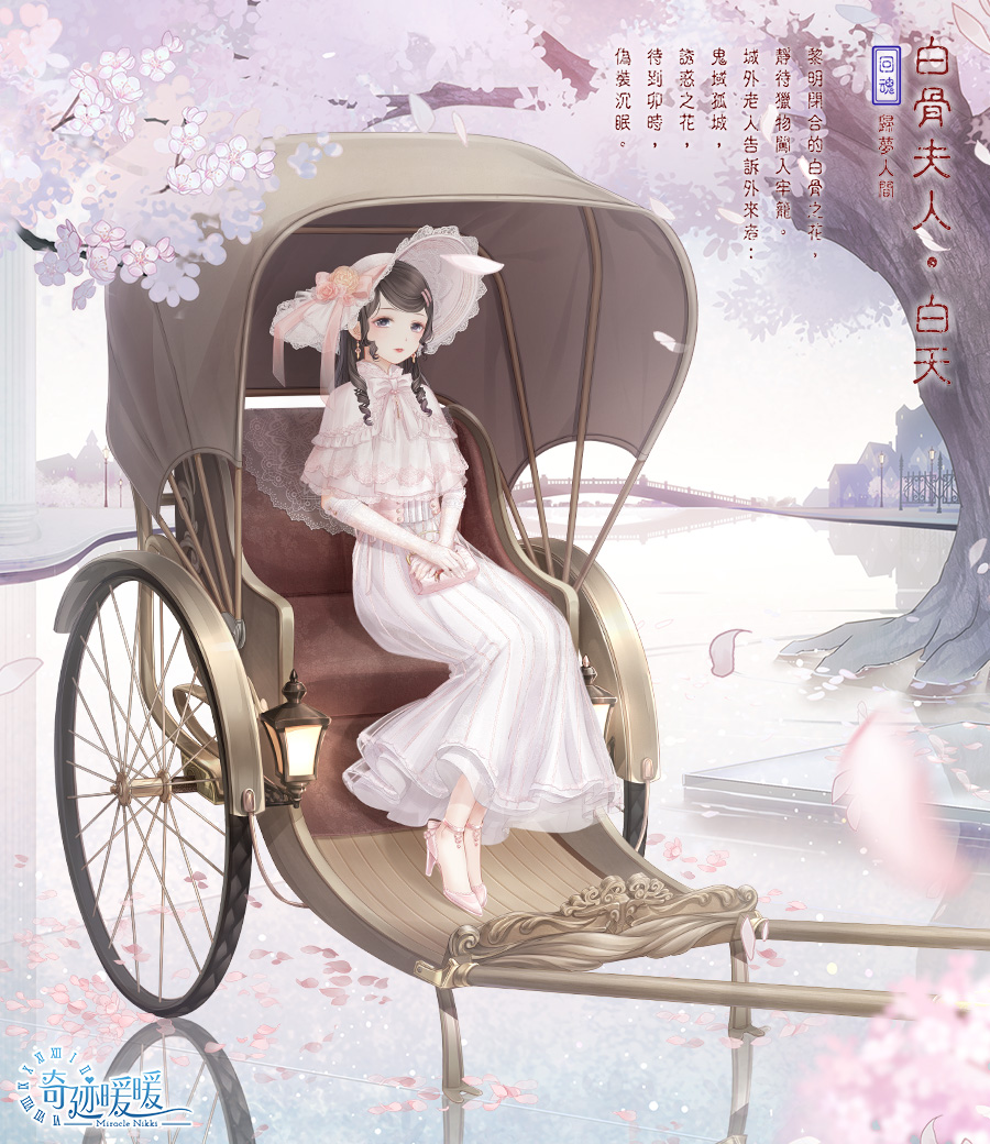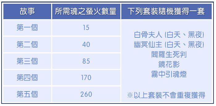 而【白骨夫人】及【幽冥仙主】最特別的地方就是,當穿上完整整套的套装,晚上18:00後套装會自動切換成[入夜]的型態。早上6:00回魂後,套装會自動切換成[回魂]的型態。如果不穿齊整套套裝的話是不會變身的唷!