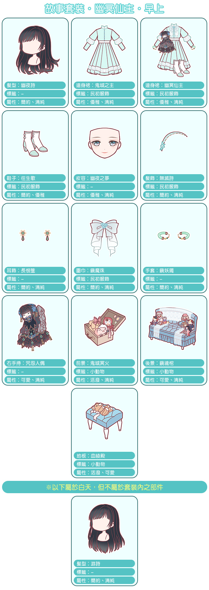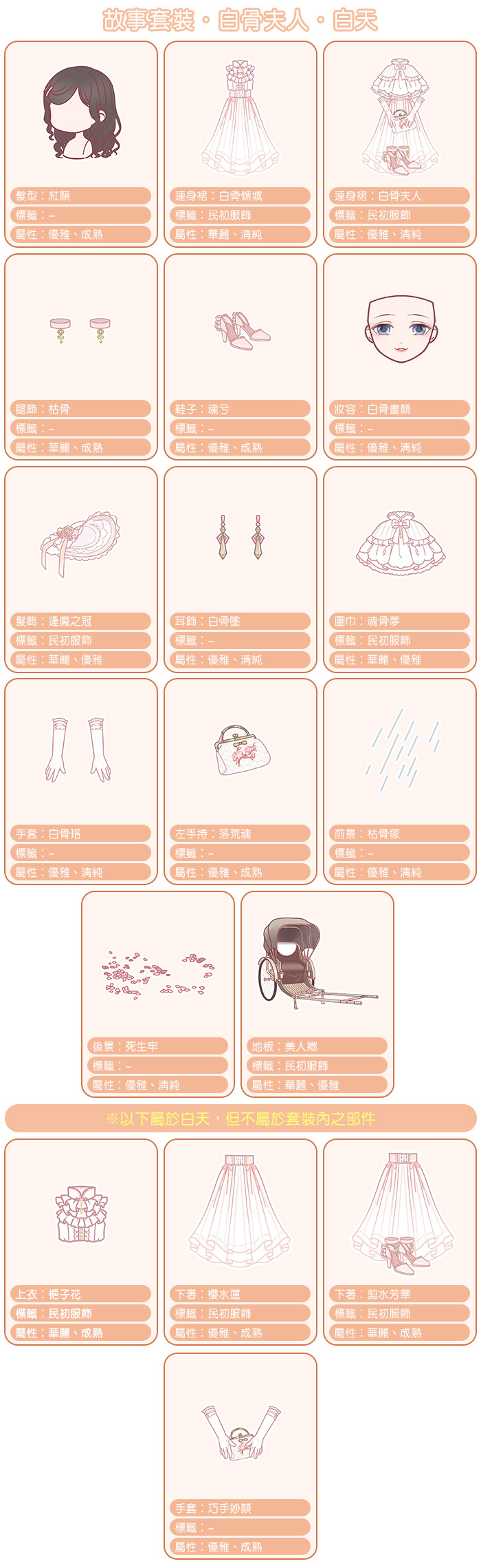 暖粉們也不用擔心,在平時換裝時,可以根據搭配需求自行選擇【白骨夫人】及【幽冥仙主】套裝部件中白天或黑夜的型態來搭配。而且,除了可以切換型態的套裝部件外,還有其他非套裝部件可以搭配,暖粉們可以參考下方小編精心製作的精美套裝圖及部件表~