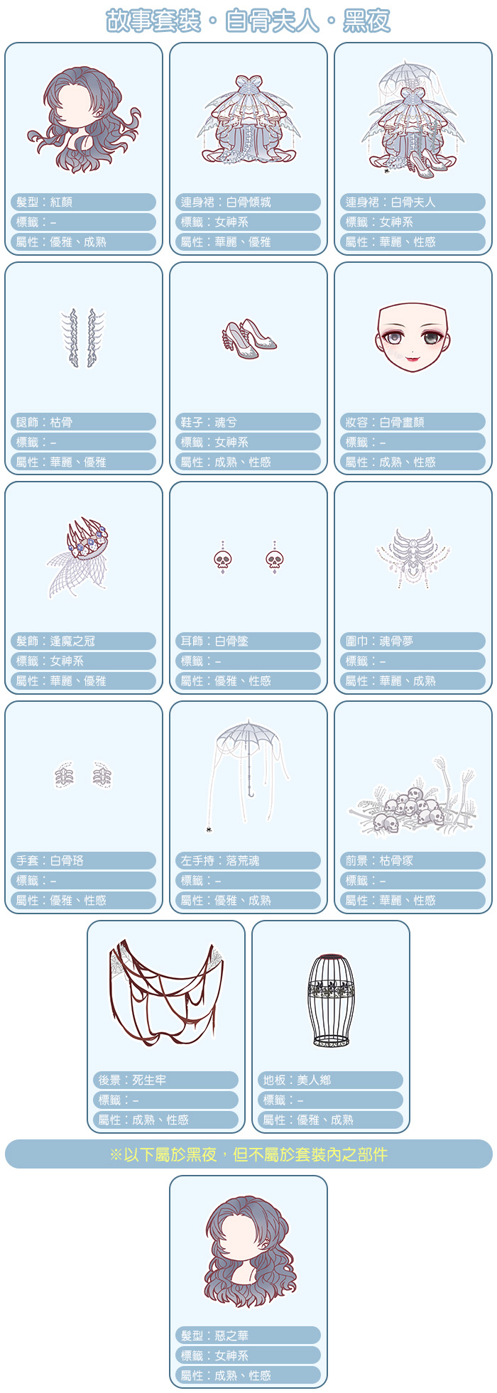 【白骨夫人.黑夜】套裝介紹: