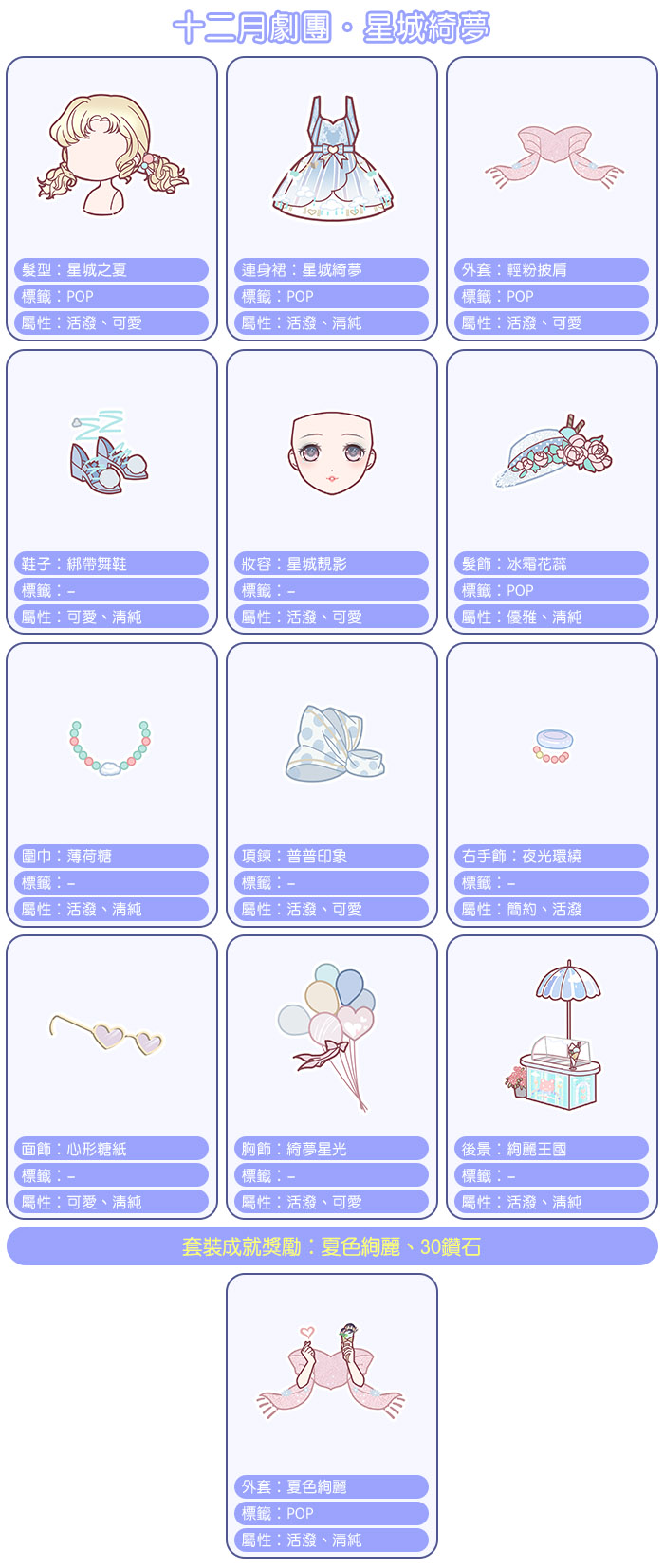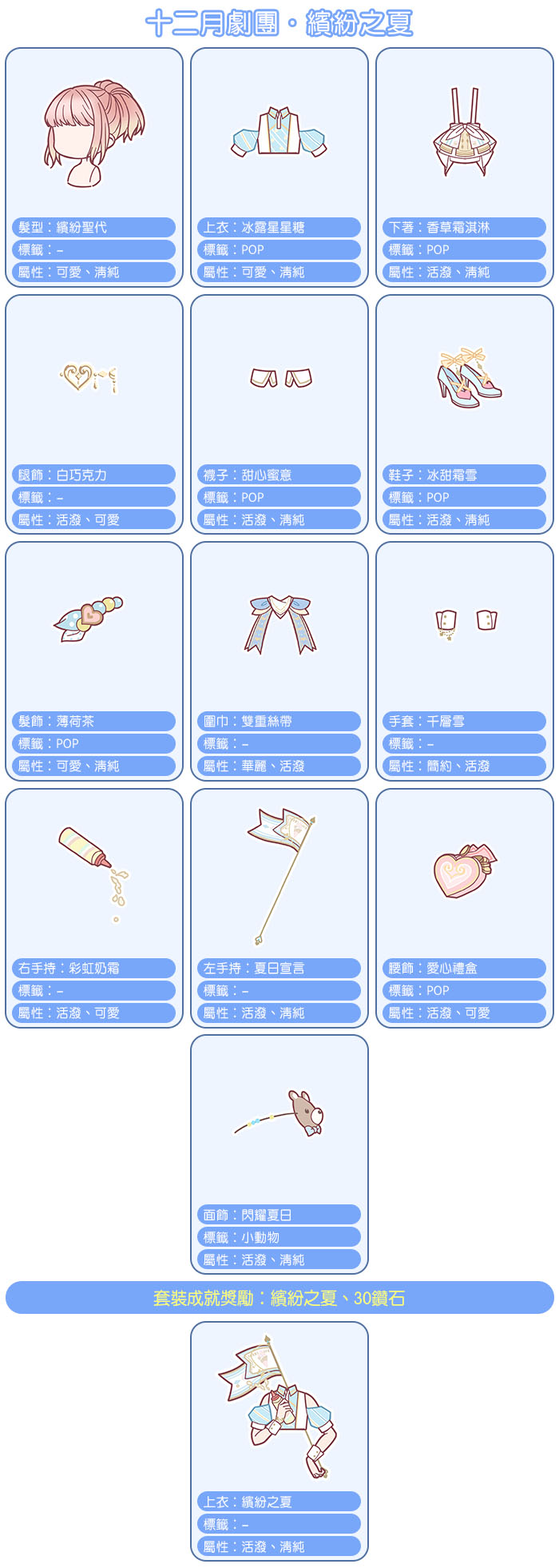 這次的套裝都好有夏天的感覺,都很俏皮可愛呢!小編特別喜歡那個後景部件,小時候對於那種賣冰淇淋的攤販,總是有種憧憬,不過才不是因為是自己想吃咧~總之,這次的活動除了要注意主題會隨機出現,其他的對暖粉來說應該沒啥難度,是個輕鬆拿套裝的活動呢!暖粉們我們下次見囉~掰逼!
