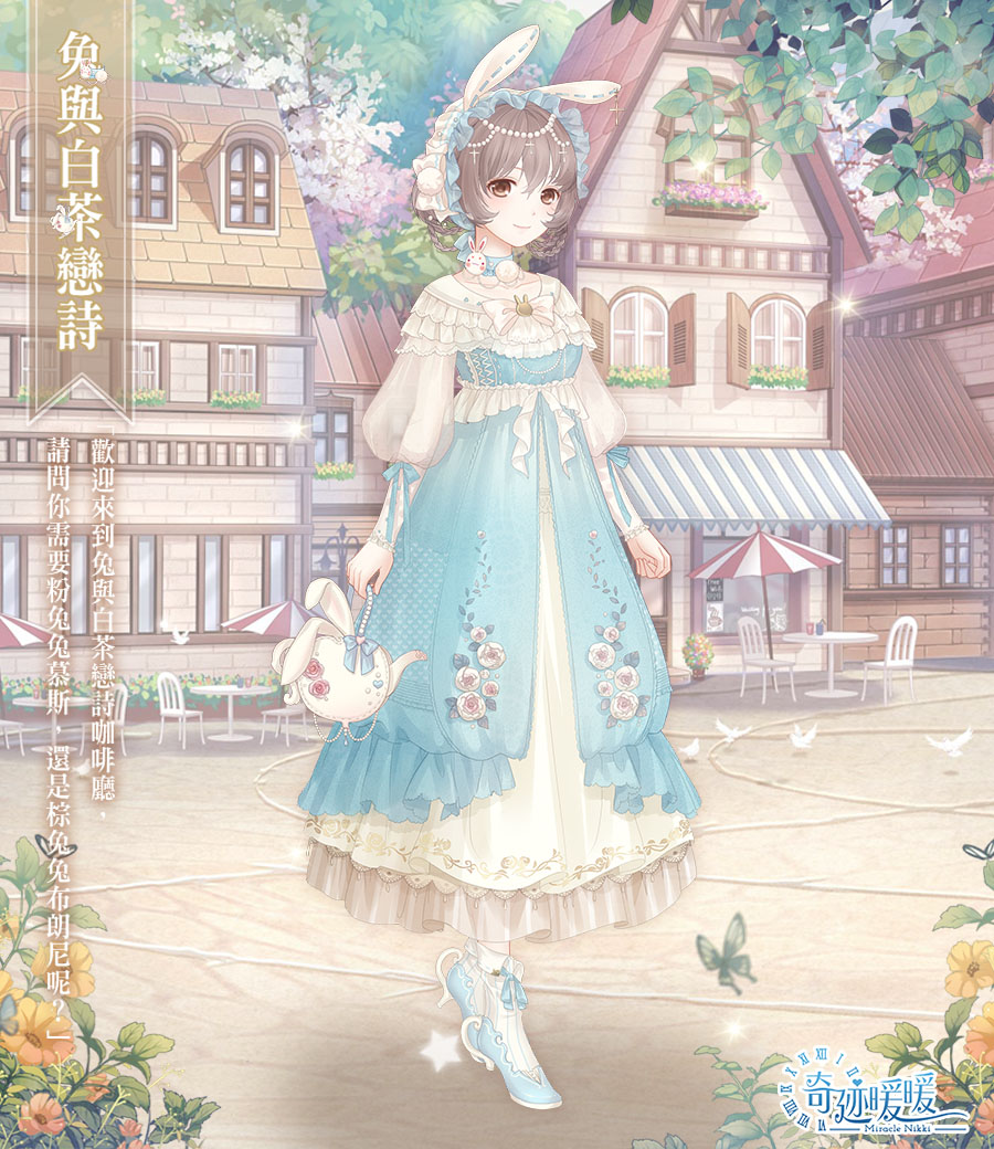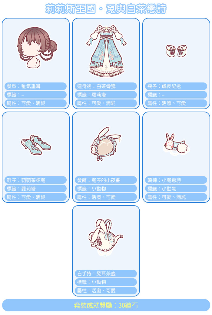 這次活動有一套儲值送套裝,只要在活動期間2018/06/23 05:00~2018/07/02 23:59內,單筆儲值100鑽以上,就可以獲得【兔與白茶戀詩】套裝。那個兔兔耳朵….*0* 小編對於可愛的動物超沒抵抗力的,顆顆(看著發抖的荷包君 (๑•̀ㅂ•́)و✧