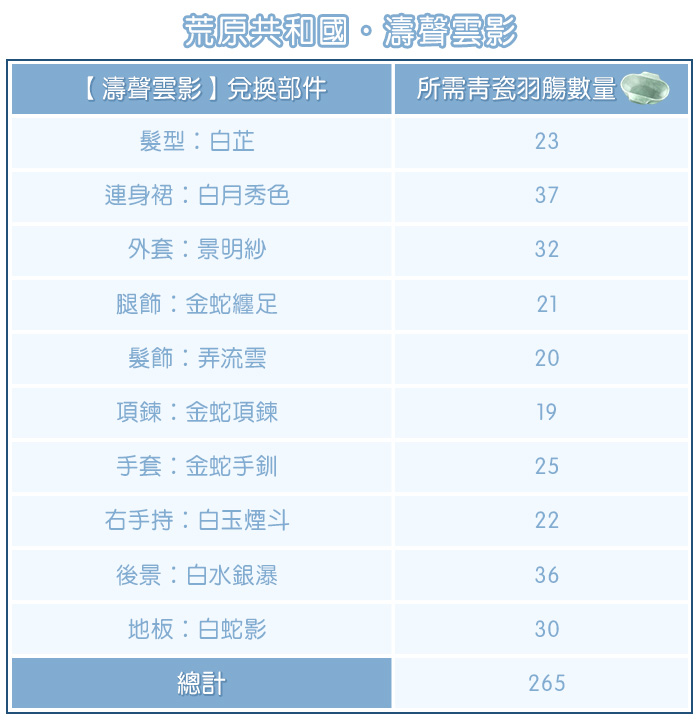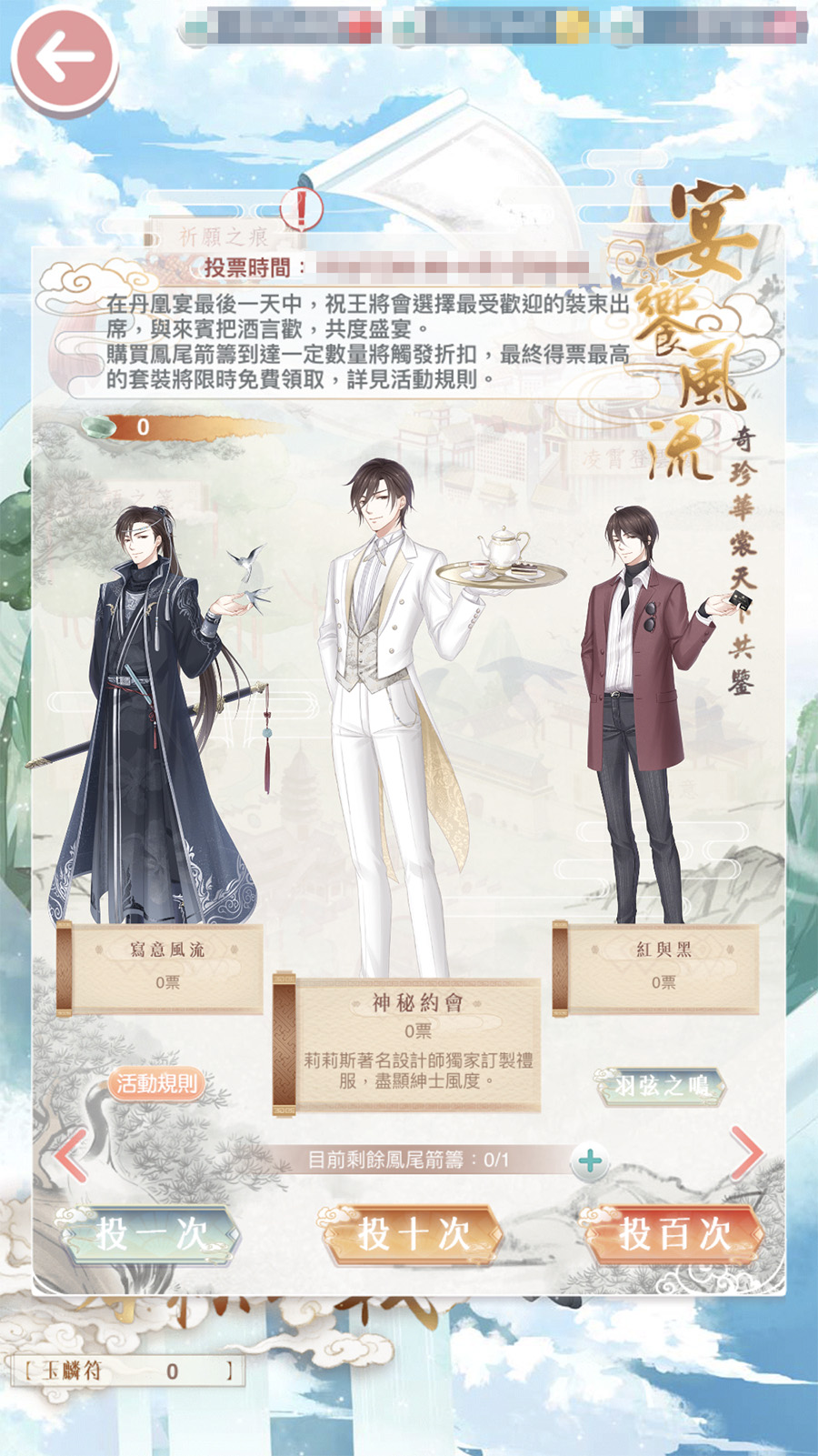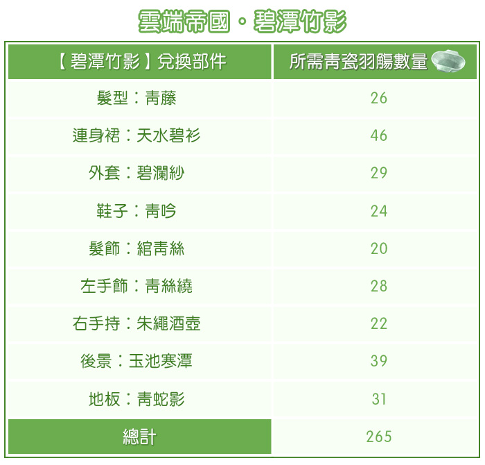 活動內容:活動投票期間內,每天有1次免費機會可以為喜歡的祝羽弦套裝投出「鳳尾箭籌」,每次投票將會獲得5個「青瓷羽觴」作為紀念。使用「青瓷羽觴」可兌換精美的【濤聲雲影】和【碧潭竹影】套裝。最終根據票數排名,祝羽弦套裝會進行相對應的優惠。需要特別注意的是,活動結束後,「青瓷羽觴」將會被清空。
