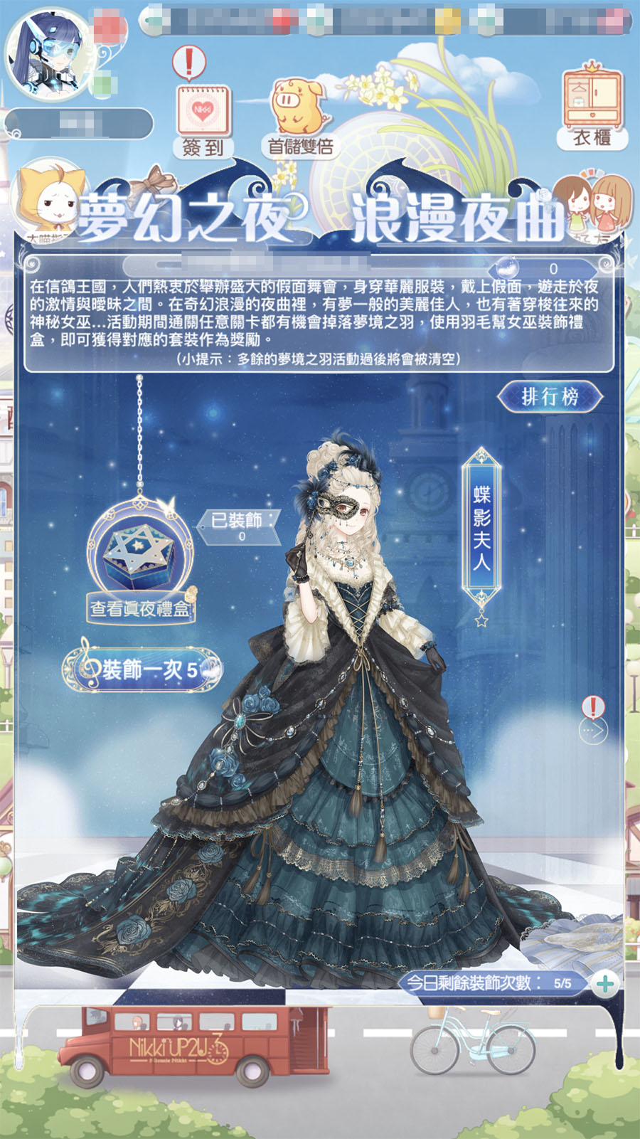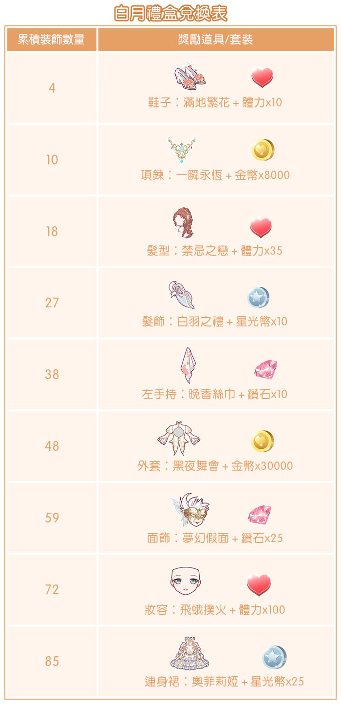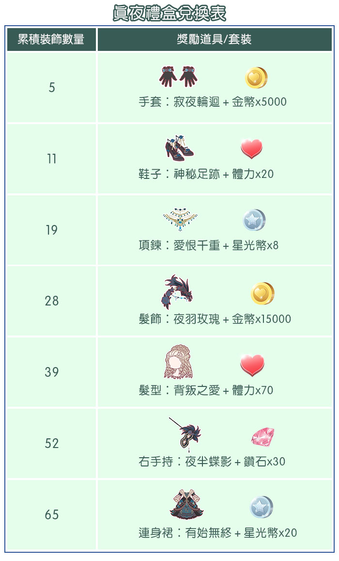 活動內容:在活動期間內通關任何劇情章節地圖關卡,就會有機會獲得「夢境之羽」,收集「夢境之羽」可以幫女巫裝飾禮盒。裝飾1次禮盒需要消耗5個「夢境之羽」,每天有5次免費的裝飾次數,重置一次裝飾次數需要花費24鑽。裝飾到達指定次數,即可依所裝飾的禮盒,獲得不同的獎勵道具及套裝部件。華麗的【蝶影夫人】及【白羽假面】套裝分別在【真夜禮盒】跟【白月禮盒】內。需要特別注意的是,活動結束後「夢境之羽」將被清空唷~