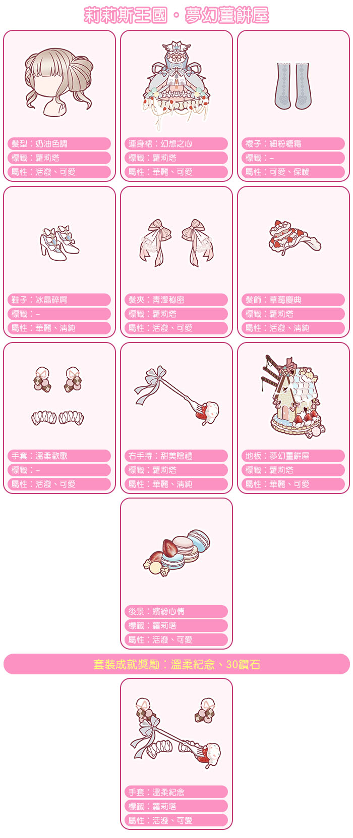 哇哇!好多馬卡龍啊~還有可愛的薑餅屋和滑嫩嫩的布丁,暖粉們是不是看著看著口水就滴下來了呢?ԅ(º﹃ºԅ)哎唷~沒關係,小編的朋友都說小編有兩個胃:一個用來裝正餐;一個用來裝甜點呢~(๑♡⌓♡๑) (๑♡⌓♡๑)趕快一起來看看【布丁的法則】與【夢幻薑餅屋】這兩套甜滋滋的套裝如何獲得吧!