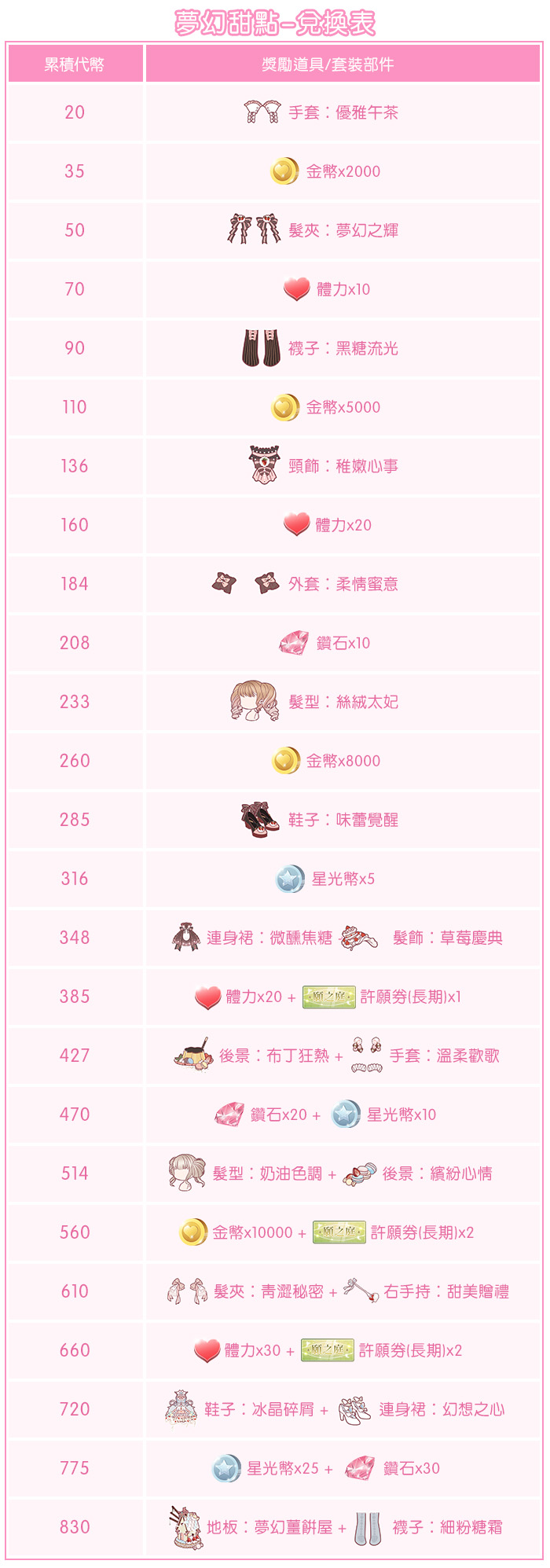下方是【布丁的法則】與【夢幻薑餅屋】套裝的兌換表,暖粉們可以參考唷~