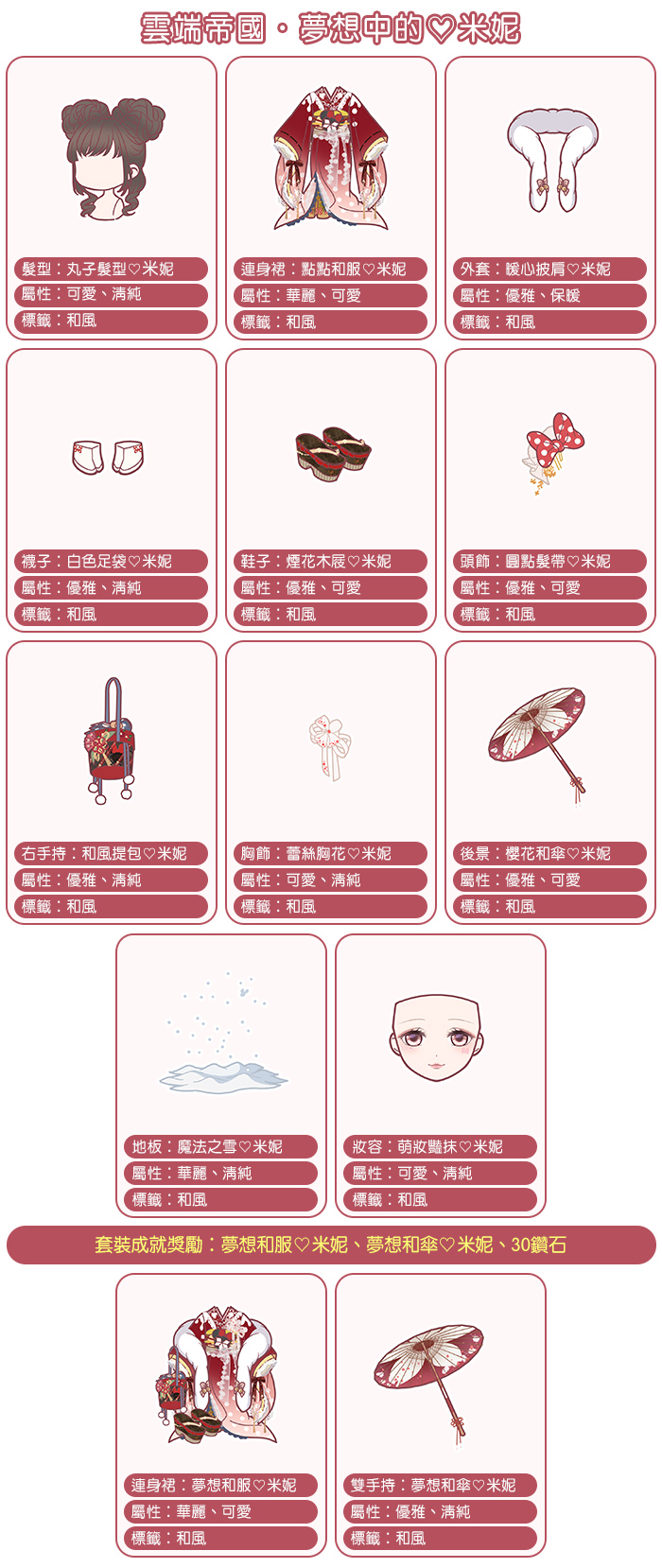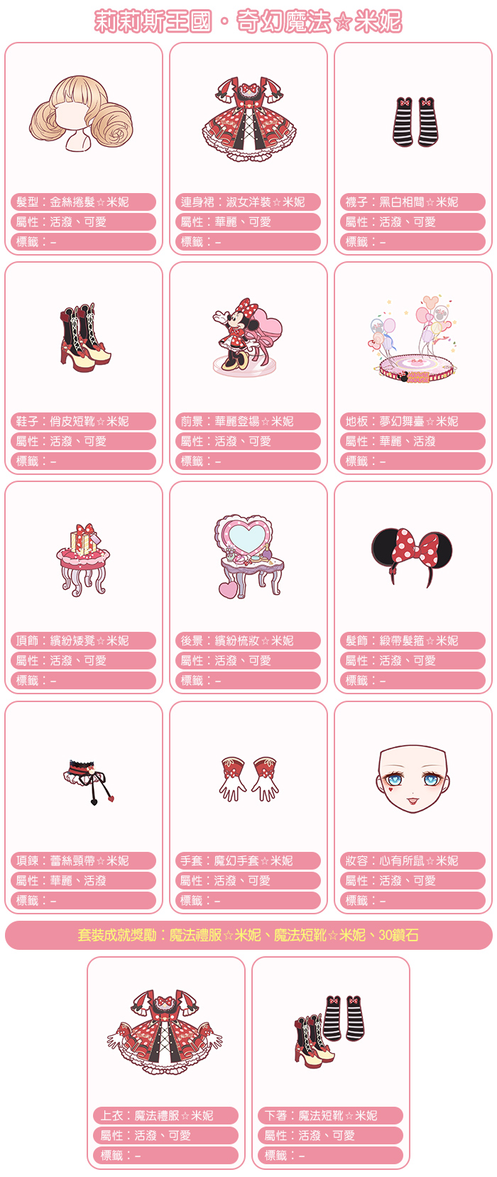 活動期間可透過指定的活動介面抽取【奇幻魔法★米奇】、【奇幻魔法☆米妮】、【夢想中的♡米妮】套裝,抽滿80次即可獲得迪士尼背景-夢幻城堡。