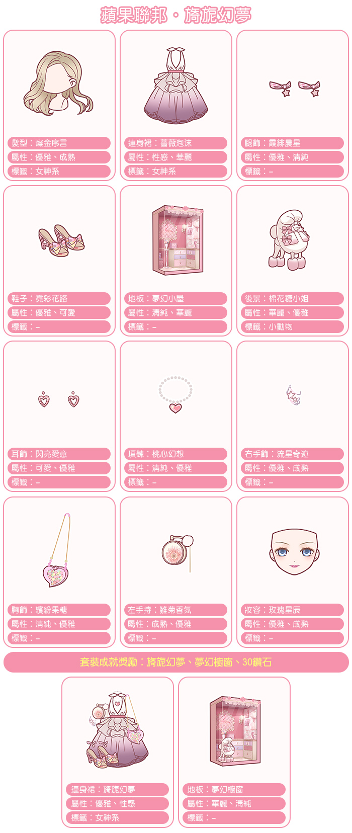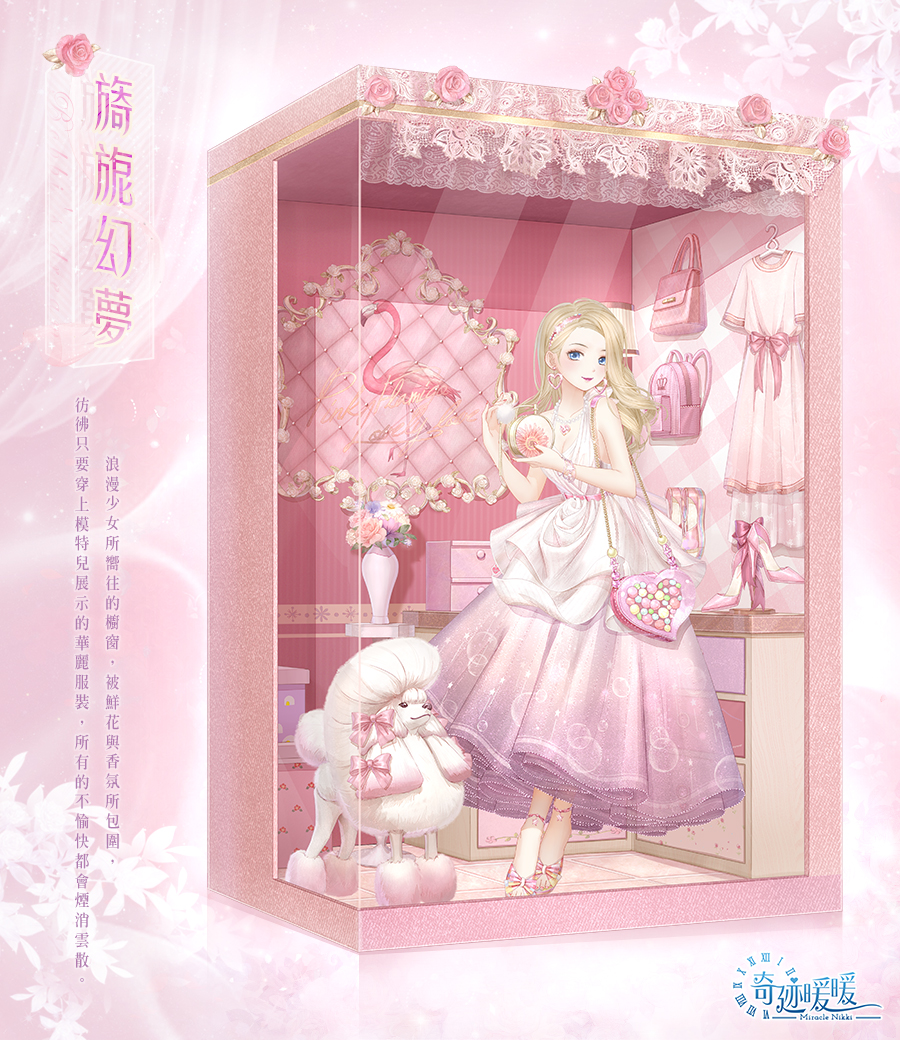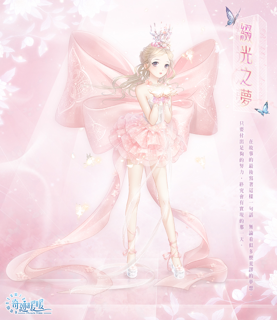 各位暖粉們安安~新套裝的介紹來囉!這次的套裝充滿了浪漫的元素:粉紅色、蕾絲和蝴蝶結,超級少女的!下方是這次的活動套裝【旖旎幻夢】與【綴光之夢】介紹,暖粉們一起來看看吧~