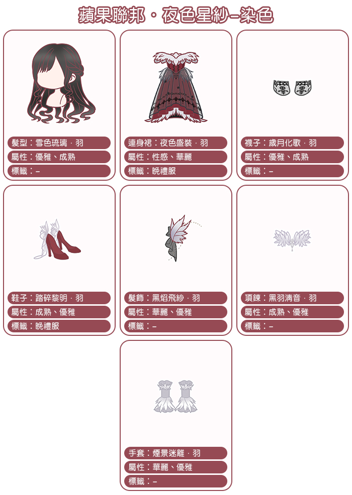 這次新章節的套裝是充滿了神祕感的黑色系套裝呢~這兩套套裝分別都有染色款,【玄羽飛燕】染色後是白色,和原色款一起看的話就像白天與黑夜,超帥氣的!小編要繼續加油完成黑白色的【玄羽飛燕】和黑紅色的【夜色星紗】(•̀ᴗ•́)و ̑̑