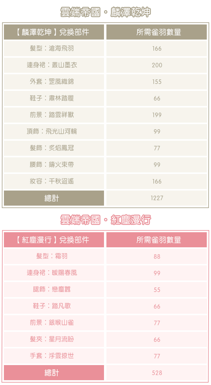 消耗「玉米」進行餵食可獲得「雀羽」,使用「雀羽」即可兌換精美雲端套裝【麟澤乾坤】、【紅塵漫行】唷~