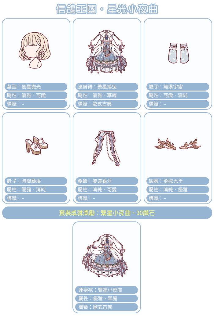 同時間,單筆購買430鑽石(含)以上,還可以獲得新套裝【星光小夜曲】唷~