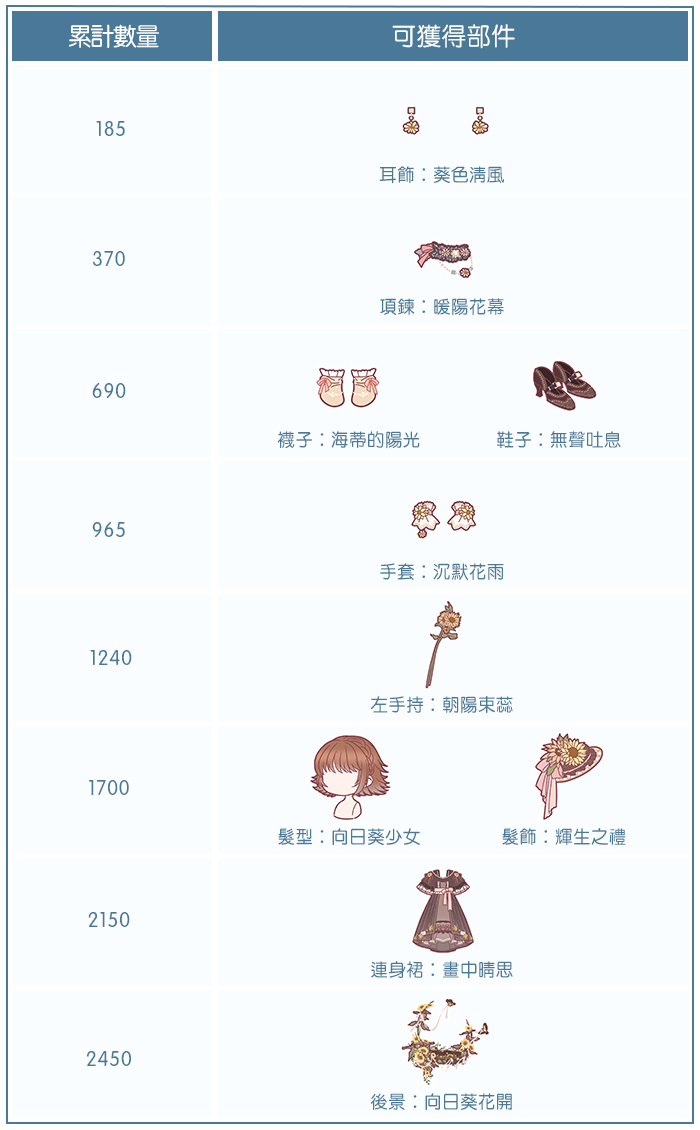 下方是兌換套裝所需要的「向日葵」數量表,暖粉們可以參考一下: