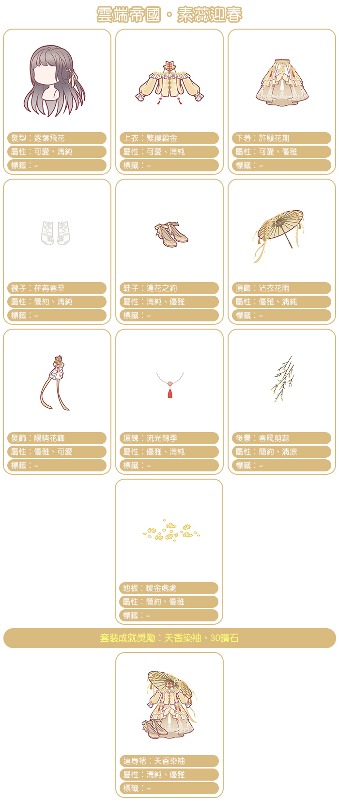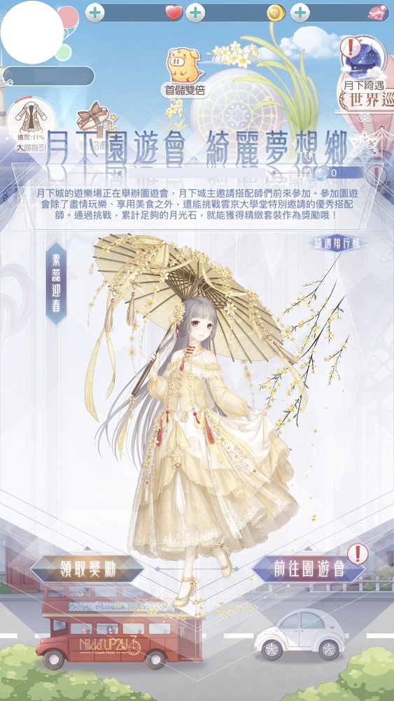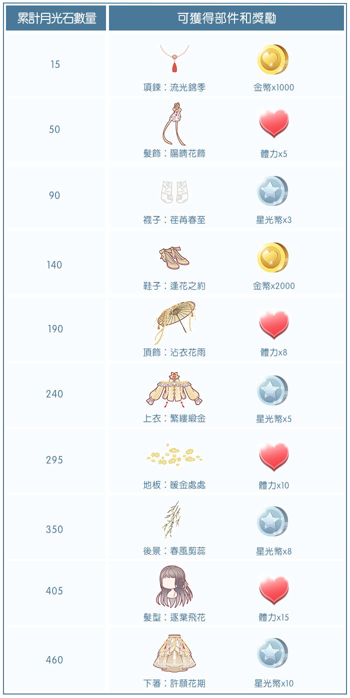 活動內容:活動期間內前往月下城園遊會,參與搭配挑戰,通過挑戰後將可獲得「月光石」。累計達到一定數量的「月光石」,即可獲得【素蕊迎春】套裝部件、金幣、體力、星光幣獎勵。