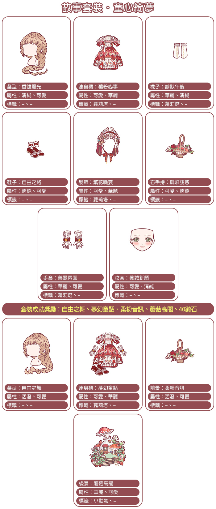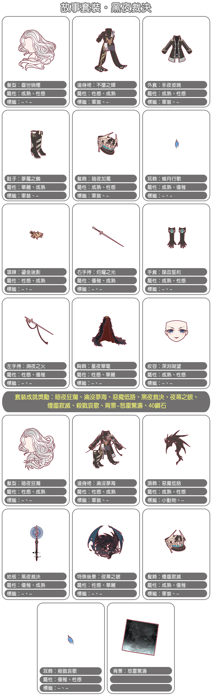 這次黑卡的套裝【破曉之誓】也太夢幻了…被白馬王子公主抱的特殊姿勢,讓小編覺得好害羞阿!【黑夜裁決】則完全貫徹了尼德霍格的帥氣,黑龍環繞在一旁呈現出的氣場完全不同!【童心綺夢】則勾勒出可愛小矮人與小動物們一同在童話森林中無憂無慮的日常,身後的香菇小屋也是在童話中才會看到的呢!(這次黛奧比的童話故事也非常可愛唷~)那麼這次的介紹在這邊先告一段落,之後還會有〈樹海靈迹.萬象之汐〉活動介紹(下)篇,會將還沒介紹完的套裝介紹給搭配師們,暖粉們記得也要準時收看喔~