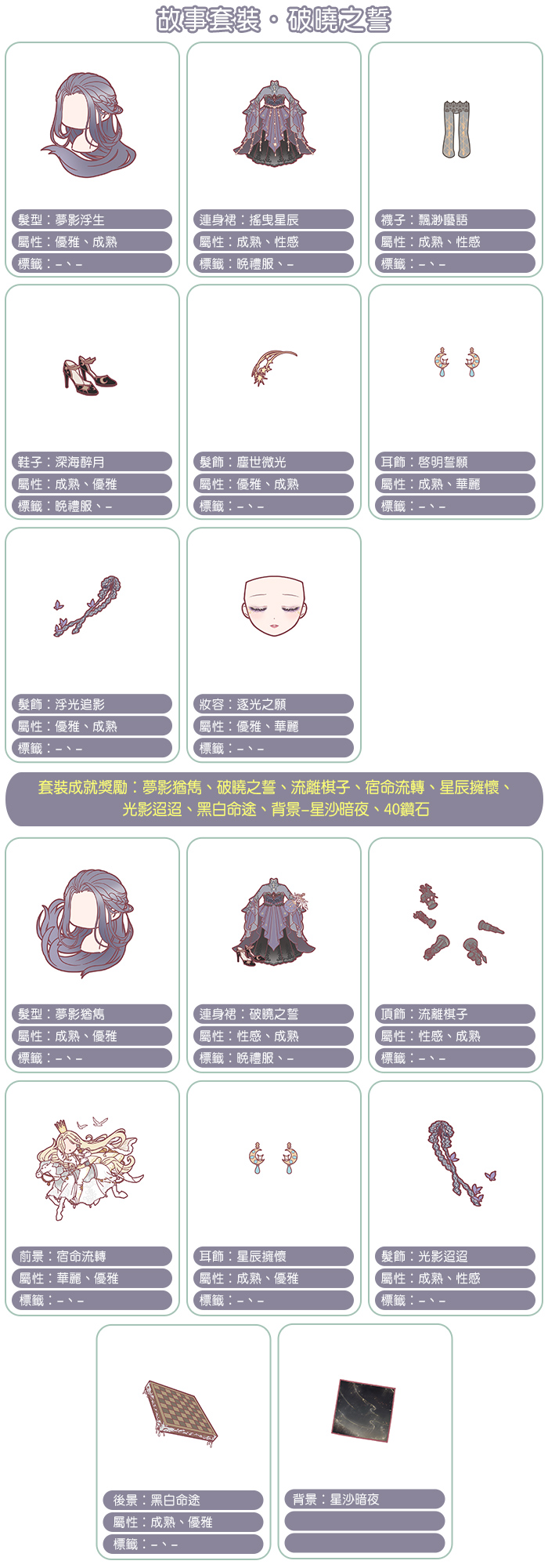 全新故事套裝《萬象之汐》即將開啟,相信很多暖粉們跟我一樣,只要出了新的故事套裝系列都會非常的激動!除了精彩的劇情之外,連套裝也都相當的精緻漂亮,馬上就想要把它們全部收入衣櫃呀呀呀!ฅ(๑*д*๑)ฅ!!讓我們一起來看看這次的活動方式以及欣賞精美的套裝圖及部件表吧~