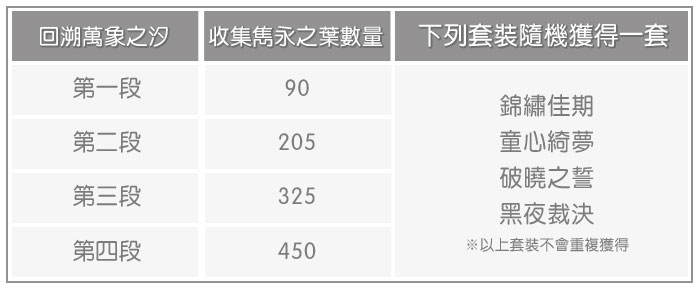 回溯1次將會獲得1個「雋永之葉」,並會隨機獲得鑽石、體力、金幣或部件。 收集一定數量的「雋永之葉」可隨機獲得四個節點可隨機喚醒到【錦繡佳期】、【童心綺夢】、【破曉之誓】、【黑夜裁決】(以上套裝將不會重複獲得)。