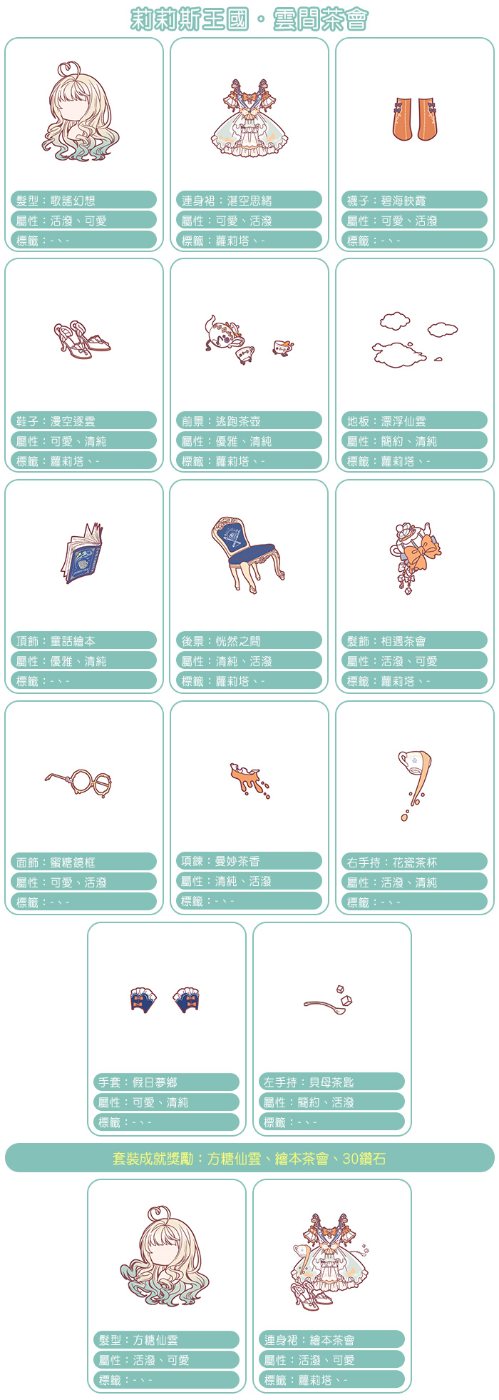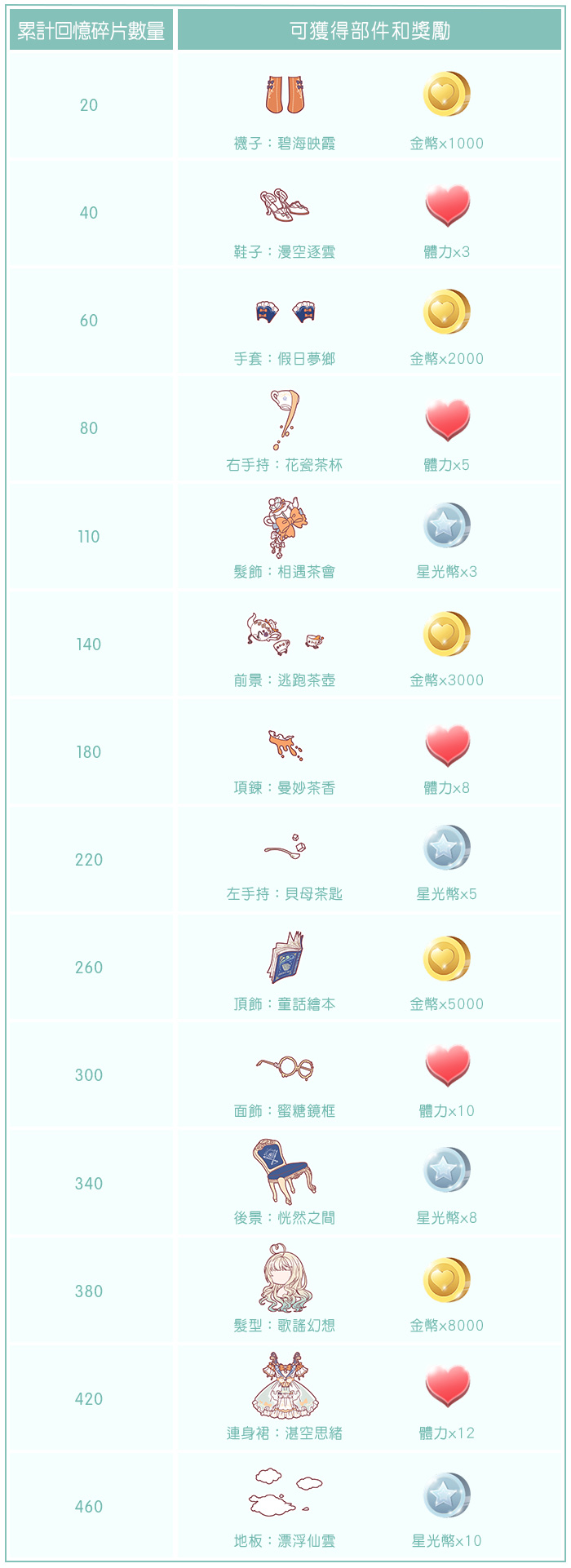 累計達到一定數量的「回憶碎片」,即可獲得【雲間茶會】套裝部件、金幣、體力、星光幣獎勵。