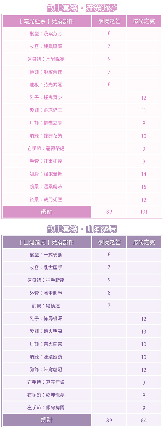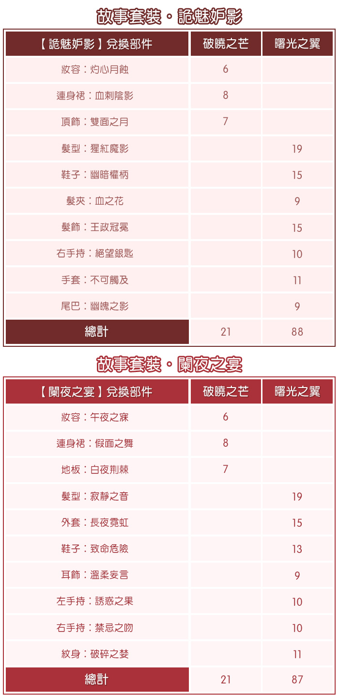 下方是使用破曉之芒和曙光之翼主要四套套裝兌換表,提供給暖粉們參考喔~