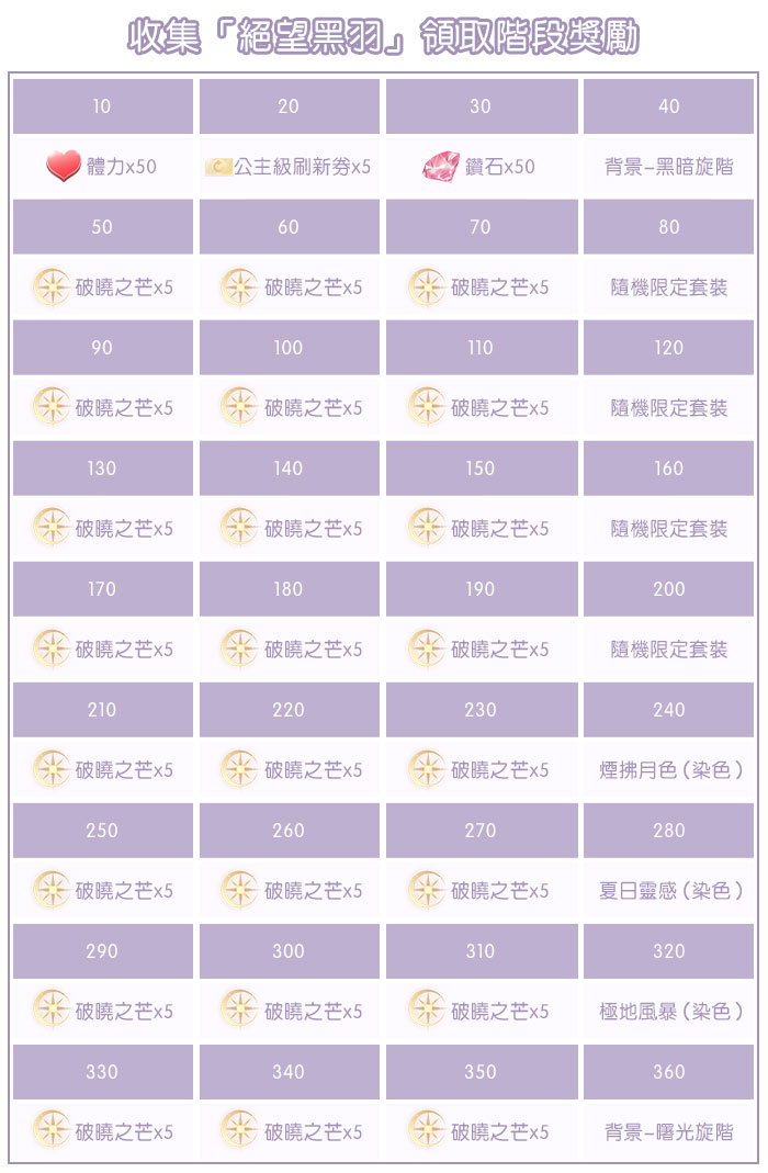 ※活動結束後,絕望黑羽、破曉之芒、曙光之翼皆不會清空。旋階之庭活動將會週期性開放,但再次開啟時將需要更多數量的絕望黑羽才可解鎖獎勵唷~