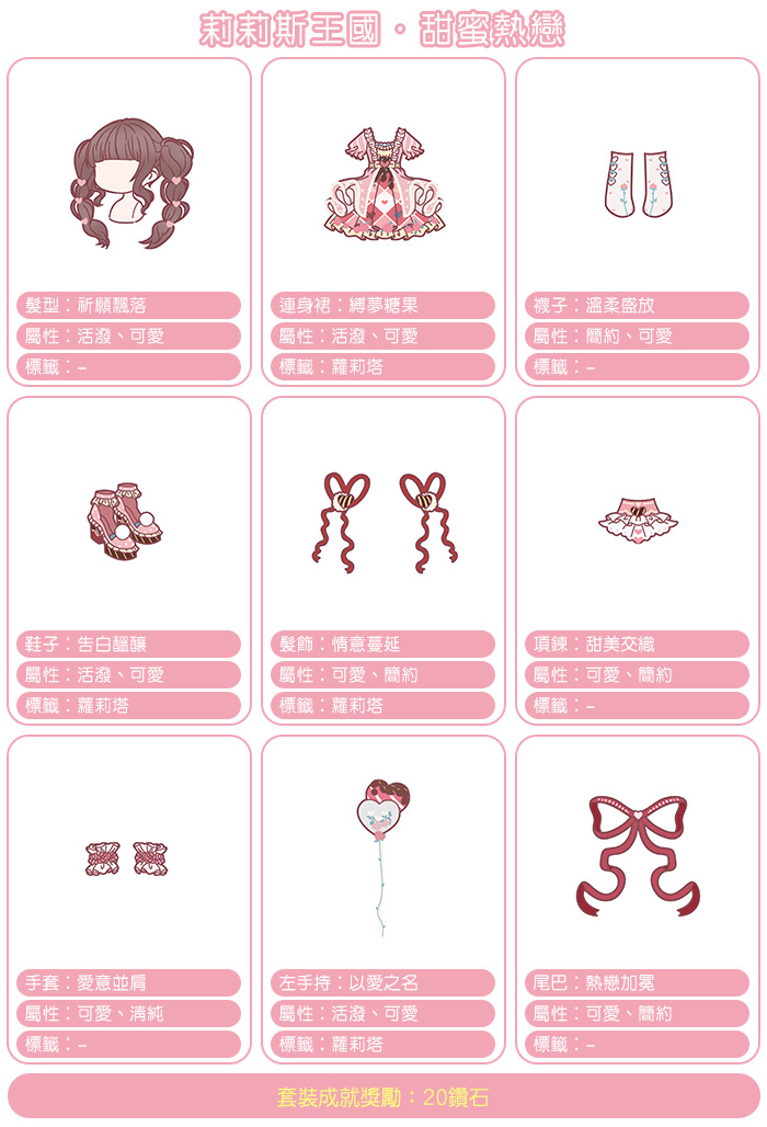 累計儲值120鑽石可獲得【甜蜜熱戀】套裝。