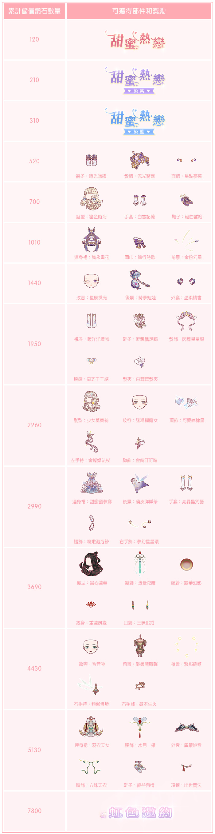 累計儲值7800鑽石可獲得【虹色邀約】復刻套裝。