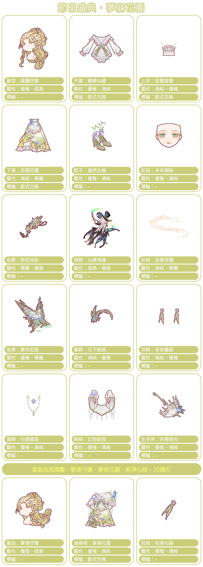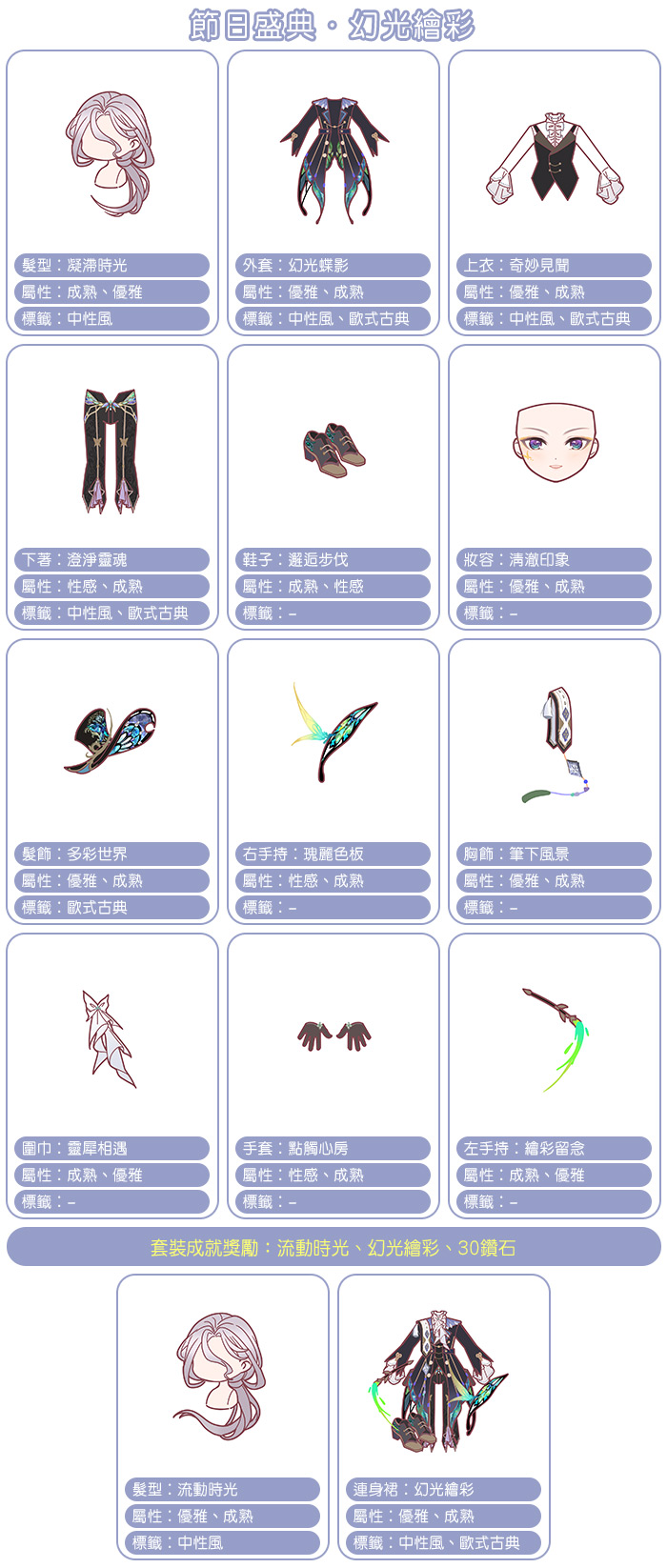 活動內容:活動期間內,通關活動地圖關卡可獲得「霓光水彩」,累計一定數量的「霓光水彩」,可收集精緻節日套裝【夢寐花園】、【幻光繪彩】。