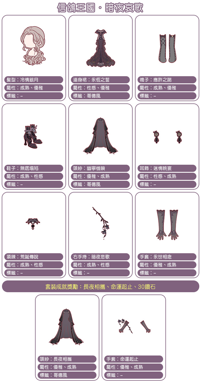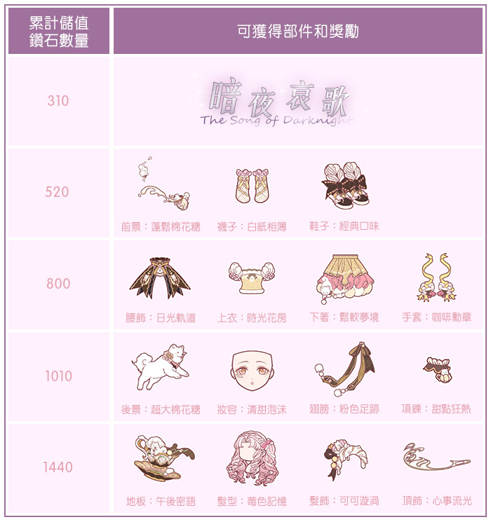 累計儲值310鑽石可獲得【暗夜哀歌】套裝。