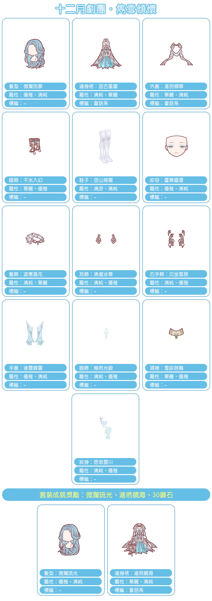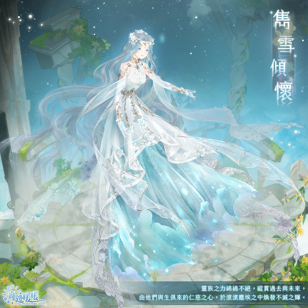 2. 集齊套裝【雋雪傾懷】,可領取靈族CG同款換裝背景〔螢然青森〕。