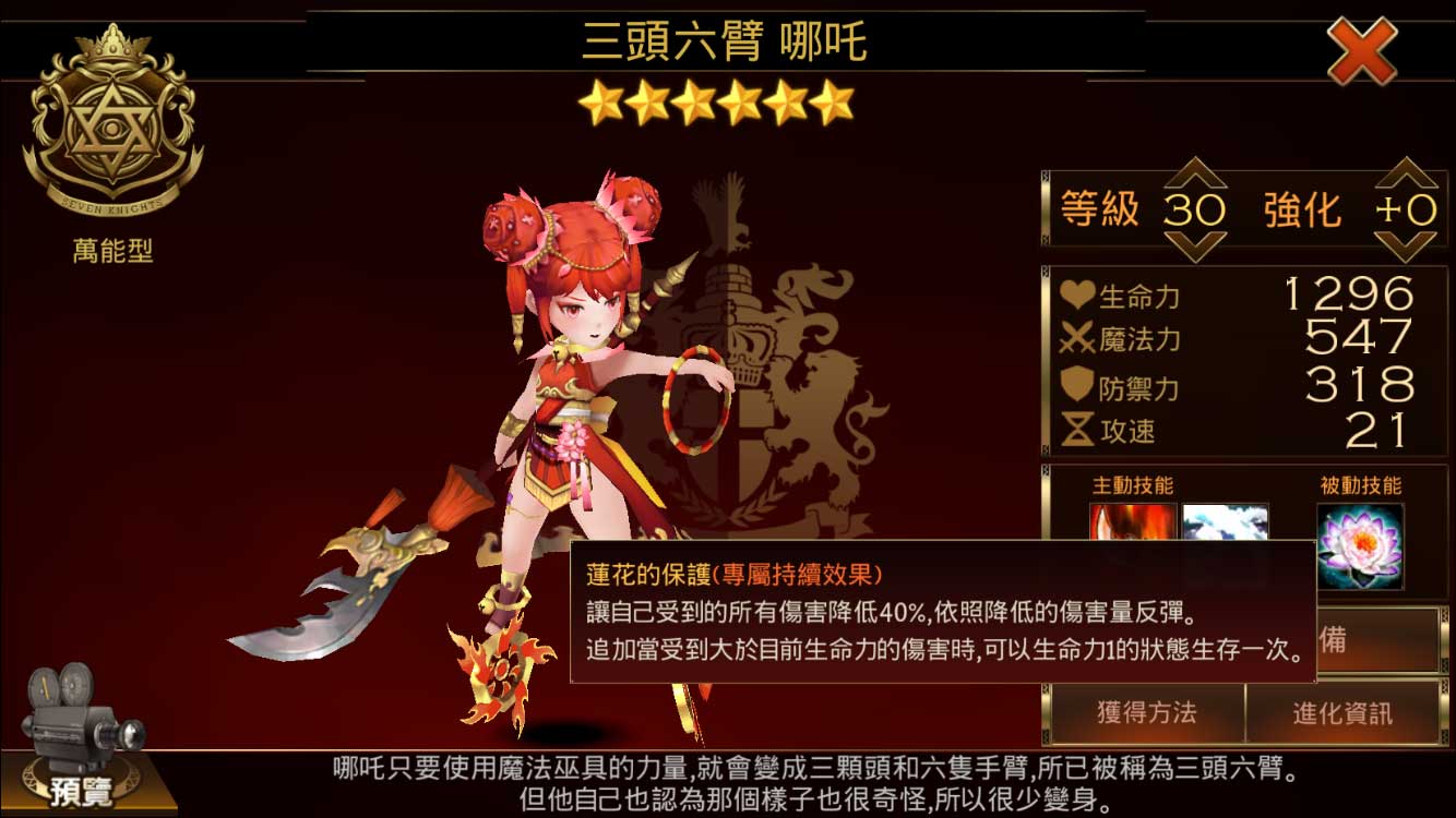 龍騎升級版的被動技能。不只降低傷害+反彈,更加上避免瞬殺的保命設定,這蓮花保護確實比復仇護甲好上一些;搞不好之後還會出個六星的「哪吒蓮花護甲」,數值硬是比「守護神傑伊普鎧甲」高也不一定。
