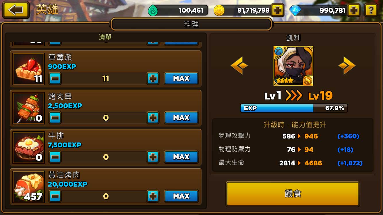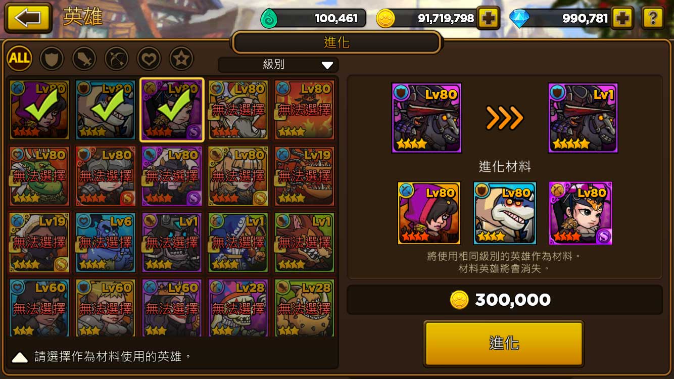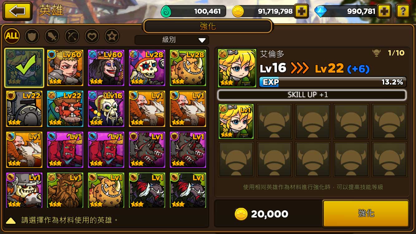 另一種升級管道則是「強化」;若你以相同的英雄作素材,不只等級會上升,技能的等級也會提升。