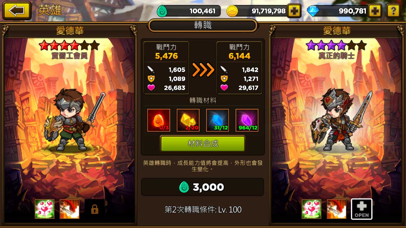 英雄達到一定等級則可轉職,不只星等顏色會產生變化,人物造型也會跟著一起蛻變、變得更加帥氣。更重要的是還能打開被動技能槽,繼承其他英雄的被動技能;玩家可藉此打造自己心目中最強的技能組合,大大提升了自由度與可玩性。