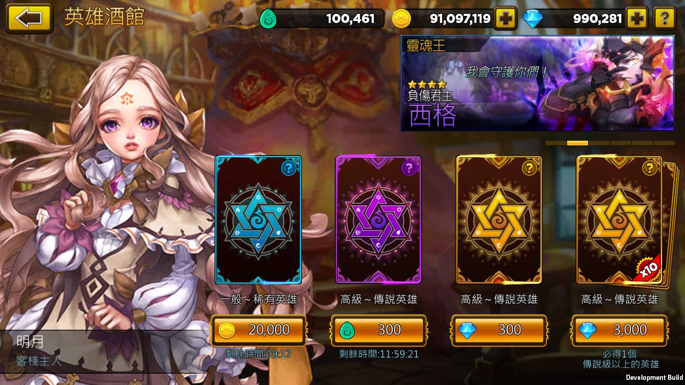 英雄酒館:在此可以招募英雄,有分使用金幣、靈魂石、鑽石抽取方式。