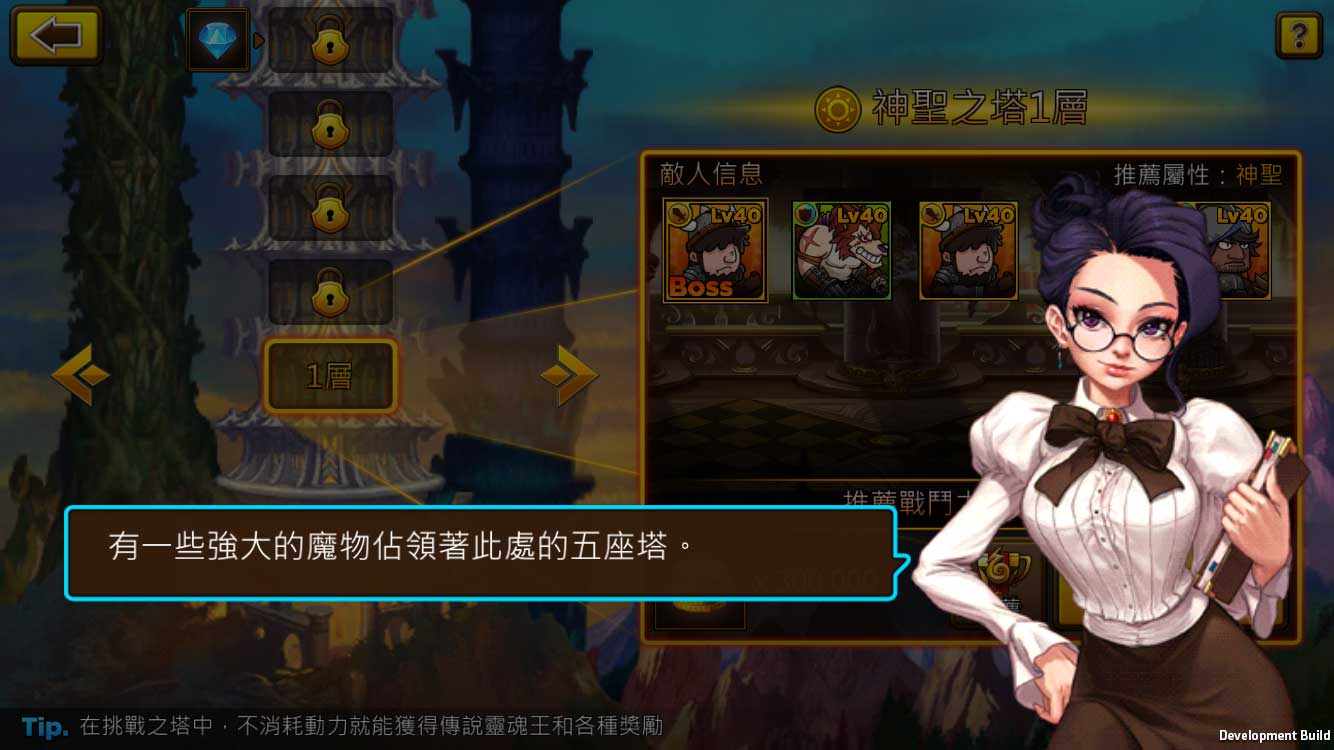 無盡之塔:滿足高端玩家的攻略慾望;五種屬性各有專屬的塔,在關卡中有非該屬性的英雄會被削弱;塔中除了各項資源獎勵,目前頂端獎勵是靈魂王角色,不容易但值得拚一下。
