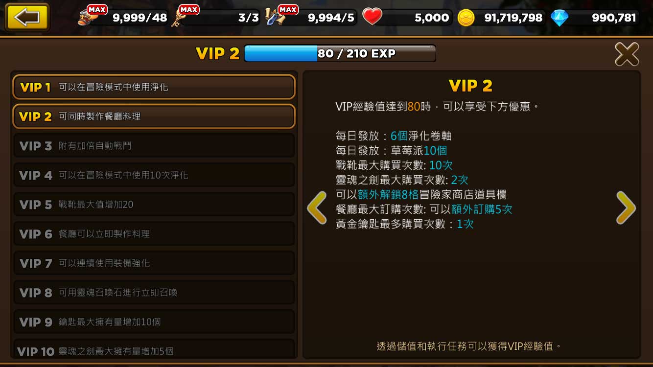《靈魂特攻隊》裡的VIP系統其實像是另一種型態的成就系統,當你完成特定任務或儲值後就會獲得VIP經驗值;提升VIP等級則可增加遊戲進行的效率。所以如果你沒有花錢,只要花的時間越多,對你越有利;但如果你儲值了,那就是大大縮短變強所需的時間。