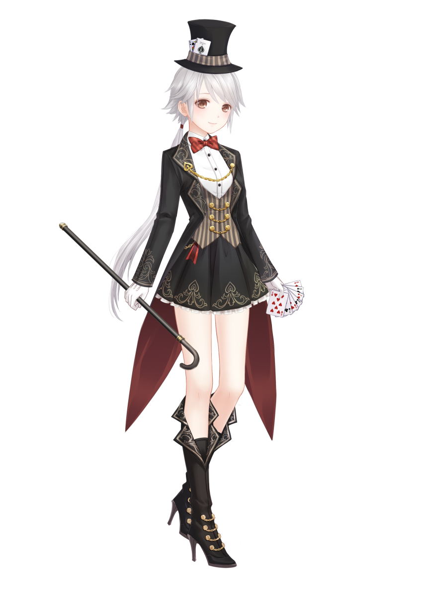 整套「魔術大師」套裝其實擁有許多衝突的屬性,例如「空靈撲克」屬性華麗,但另一個手持物「黑耀手杖」卻是簡約屬性;「次元禮帽」成熟,「魔幻領結」卻是可愛;「熠熠長髮」清純,「幻影披風」性感。但就有如魔術一般,眾多衝突的屬性結合在這套裝中,是不是很奇妙呢?