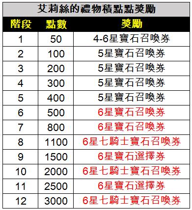 新的艾莉絲禮物獎勵(寶石)內容可參考下表 :