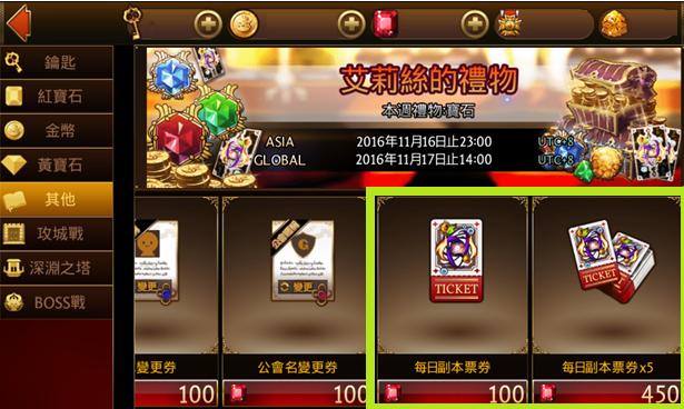 - 每日副本票券可經由"商店->共同->其它"頁籤中來進行購買