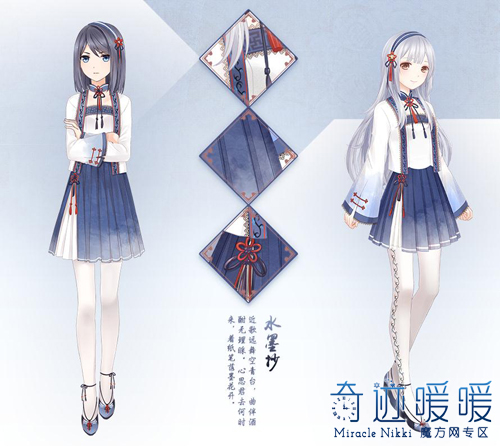 「水墨抄」的服裝說明,更有種想愛卻不知該如何說出口的鬱塞,只好將心寄情筆墨,隨意揮灑抒發情意;套裝的屬性是簡約、可愛與清純,也很貼近黑卡常給人的反差萌形象。