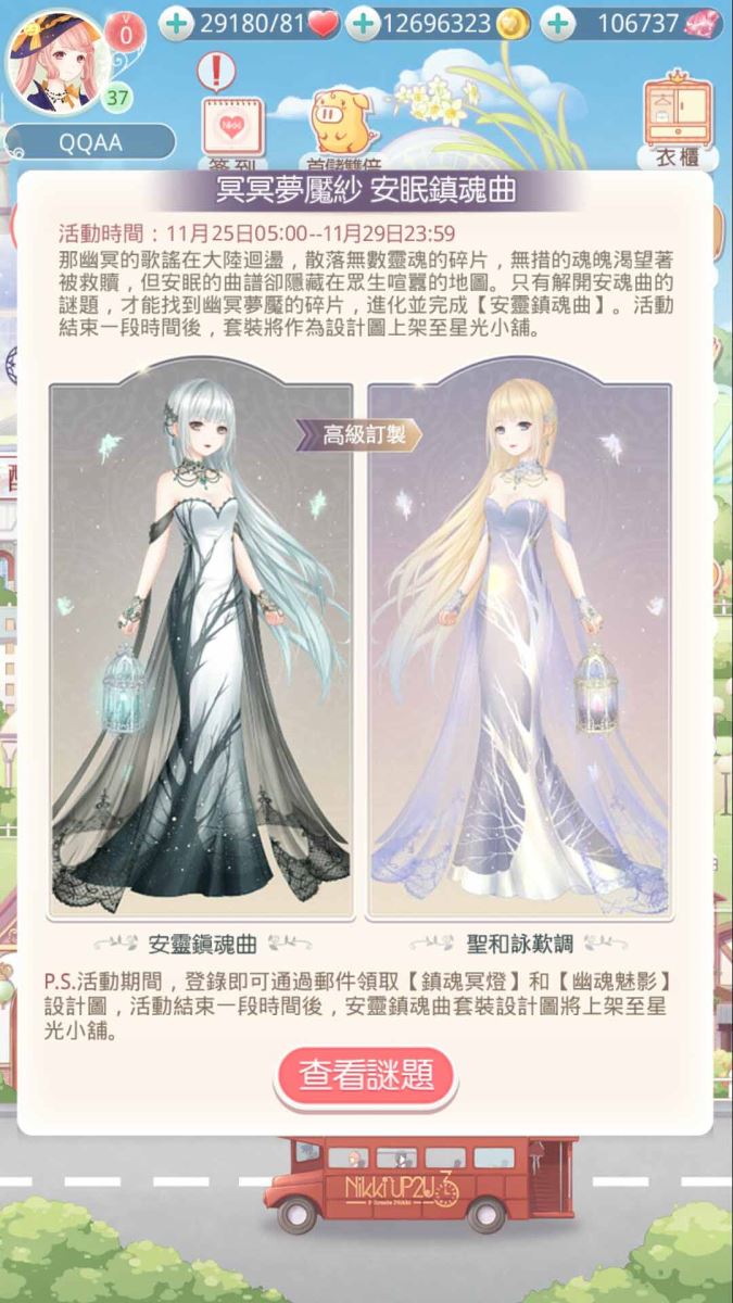 人去世以後靈魂會飄往何處呢?為了撫慰在煉獄中的逝者,「鎮魂曲」又稱為安魂曲、安魂彌撒,在多數的葬禮中被詠唱,可縮短亡靈們在煉獄中的日子、令他們更早進入天國。「詠嘆調」則泛指任何的抒情音樂旋律。古典音樂作曲家莫扎特也創作出許多具有獨立主題的詠嘆調,而莫扎特最後的作品之一也包括了「d小調安魂曲」。在《奇迹暖暖》新活動「安眠鎮魂曲」以此為主題,設計出匹配肅穆、成熟,又不失性感的【安靈鎮魂曲】套裝,完成謎題尋找在暖暖大陸中散落的服裝部件碎片,即可完成套裝。【安靈鎮魂曲】套裝經過進化與高級訂製,可以生成成熟優雅、又帶有音樂家氣質的【聖和詠歎調】套裝。大家一起為了撫慰亡靈而努力吧!