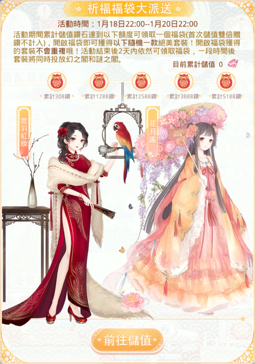 活動說明:活動期間累計儲值鑽石達到以下額度可領取一個福袋(首次儲值雙倍贈鑽不計入),開啟福袋即可獲得以下隨機一款絕美套裝!開啟福袋獲得的套裝不會重複哦!活動結束後2天內依然可領取福袋,一段時間後套裝將同時投放幻之閣和謎之閣。