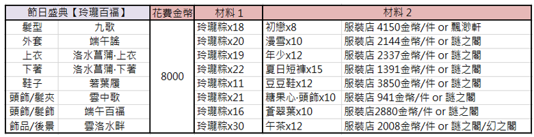 收集的玲瓏粽可以兌換節日盛典套裝【玲瓏百福】的部件,小編在這邊為大家整理【玲瓏百福】部件需要的材料與材料出處。